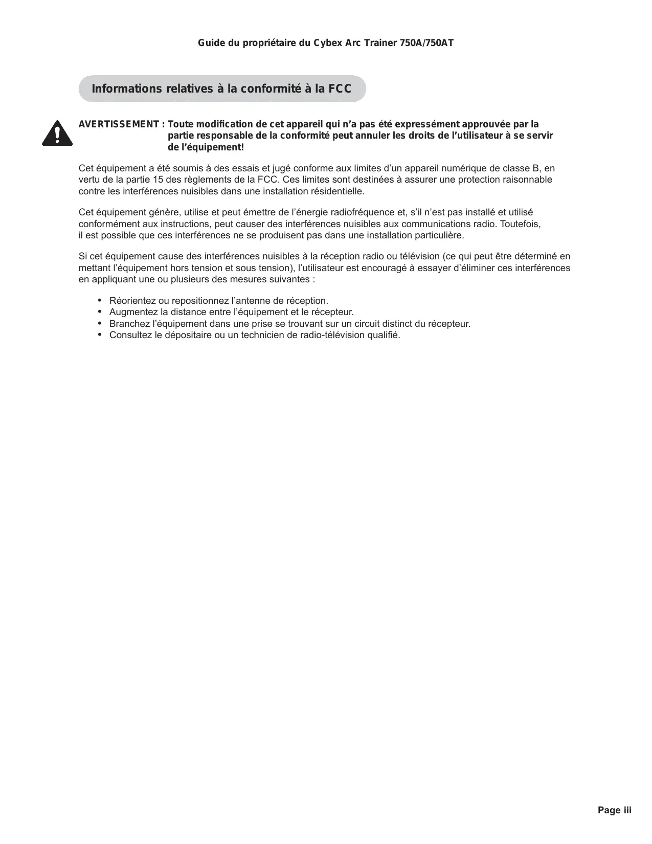 CLAUSE DE NON-RESPONSABILITÉ : Cybex International, Inc. ne fait aucune déclaration et n'offre aucune garantie quant au contenu de ce guide. Nous nous réservons le droit de réviser ce document à tout moment et d'apporter des modifications au produit qu'il déscrit, sans préavis ni obligation d'avertir quiconque de telles révisions ou modifications.