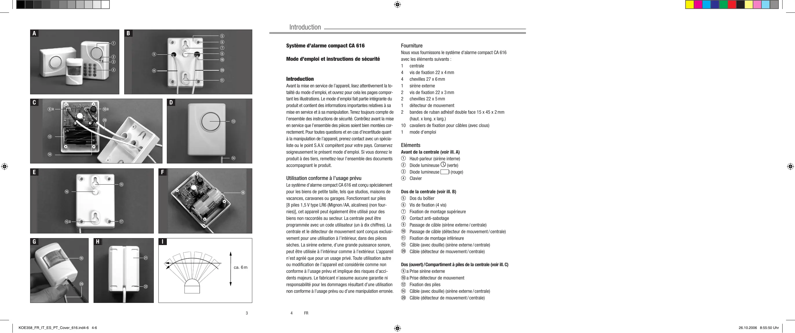 Le système d'alarme compact CA 616 est unconspécialement pour les biens de petite talle, tels que studios, maisons de vacances, caravanes ou garages. Fonctionnant sur piles [8 piles 1,5 V type LR6 (Mignon/AA, alcalines) (non fournies)], cet apparéil peut également être utilisé pour des biens non raccordés au secteur. La centrale peut être programmée avec un code utilisateur (un à dix chiffres). La centrale et le détector de mouvement sont unconspécus exclusivement pour une utilisation à l'intérieur, dans des pieces sèches. La sirène externe, d'une grande puissance sonore, peut être utilisée à l'intérieur comme à l'extérieur. L' apparéil n'est agrée que pour un usage privé. Tout utilisecation autre ou modification de l' apparéil est considérée comme non conforme à l'utilisation prévu et implique des risques d'accidents majorés. Le fabricant n'assume aucune garantie ni responsabilité pour les dommages résultat d'une utilisation non conforme à l'utilité prévu ou d'une manipulation erronée.