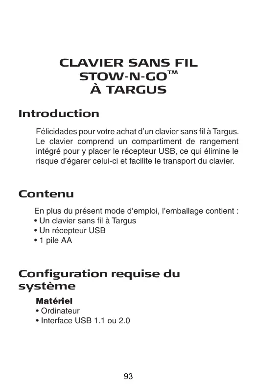 En plus du présent mode d’emploi, l’emballage contient : • Un clavier sans fil à Targus • Un récepteur USB