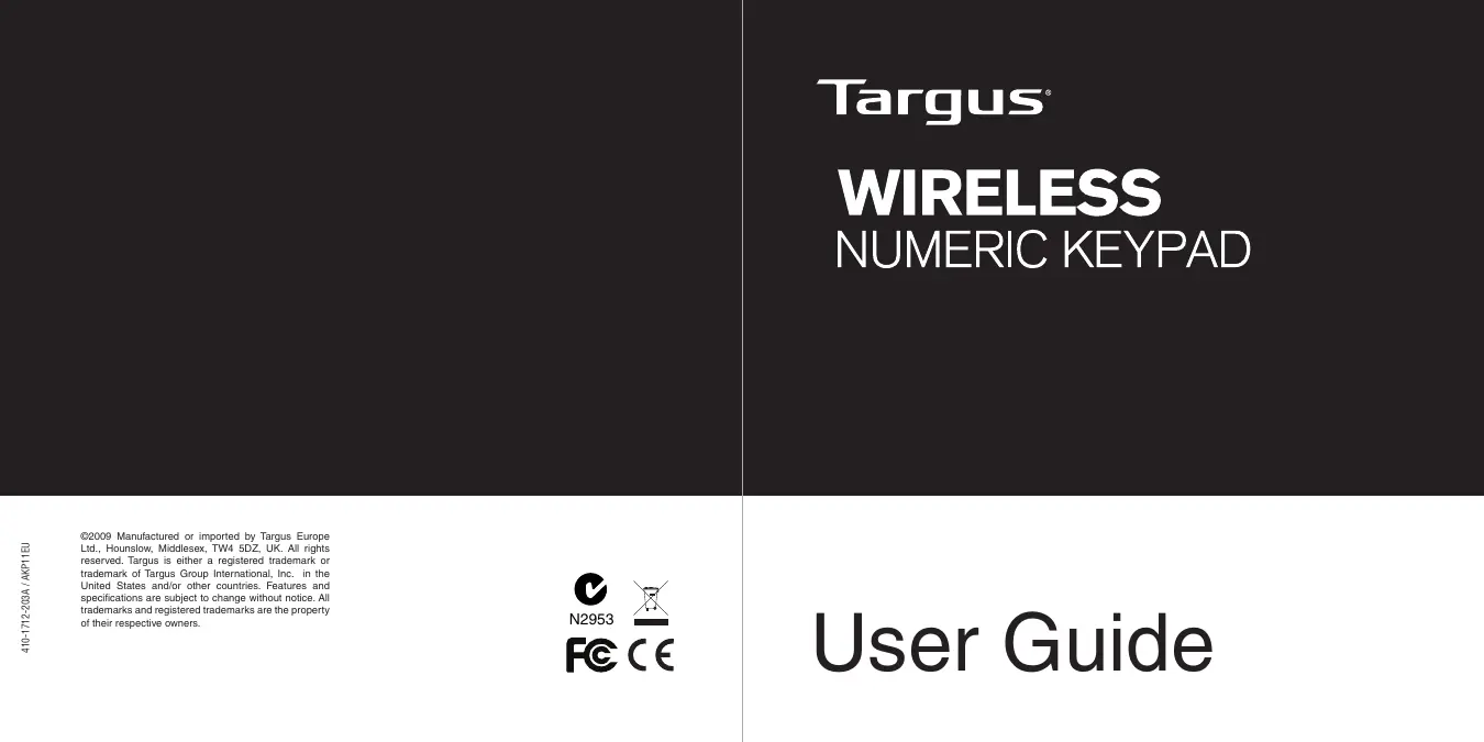 Targus Wireless Numeric Keypad FR – Introduction Targus Wireless Numeric Keypad Installation de la pile Nous vous remercions d’avoir acheté ce pavé numérique sans fil de chez Targus. Ce pavé numérique est fourni avec un récepteur USB que vous rangez dans le pavé, très pratique pour travailler lors de vos déplacements. Contenu de la boîte