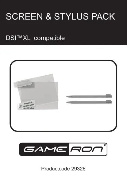 Tout d’abord nous vous remercions d’avoir acheté cet accessoire GAMERON™. Afin d’assurer les meilleures performances de votre produit, veuillez conserver ce manuel d’instructions pour référence ultérieure. CONTENU A. 2x Films de protection. B. 2x Stylets C. 1x Lingette nettoyante FONCTIONS A. Les 2 films de protection évitent les rayures et l’usure des 2 écrans. B. Les stylets servent à jouer sur l’écran tactile. C. Les stylets peuvent se ranger dans l’espace d’origine prévu par la DSi™ XL. Garantie Ce produit est garanti trois ans à partir de la date d’achat. Durant cette période, en cas de défaillance résultant de matériaux défectueux ou de vices de fabrication, le détaillant auquel vous avez acheté le produit remplacera celui-ci par un modèle identique ou similaire, sur présentation de votre ticket de caisse ou de votre preuve d’achat.3Cette garantie ne couvre pas les défaillances résultant de dommages accidentels, d’un usage incorrect ou d’une usure anormale. Consignes et précautions importantes