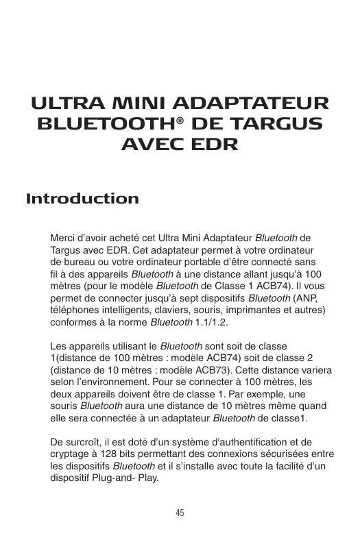 AVEC EDR Introduction Merci d’avoir acheté cet Ultra Mini Adaptateur Bluetooth de Targus avec EDR. Cet adaptateur permet à votre ordinateur de bureau ou votre ordinateur portable d’être connecté sans fil à des appareils Bluetooth à une distance allant jusqu’à 100 mètres (pour le modèle Bluetooth de Classe 1 ACB74). Il vous permet de connecter jusqu’à sept dispositifs Bluetooth (ANP, téléphones intelligents, claviers, souris, imprimantes et autres) conformes à la norme Bluetooth 1.1/1.2. Les appareils utilisant le Bluetooth sont soit de classe 1(distance de 100 mètres : modèle ACB74) soit de classe 2 (distance de 10 mètres : modèle ACB73). Cette distance variera selon l’environnement. Pour se connecter à 100 mètres, les deux appareils doivent être de classe 1. Par exemple, une souris Bluetooth aura une distance de 10 mètres même quand elle sera connectée à un adaptateur Bluetooth de classe1. De surcroît, il est doté d’un système d’authentification et de cryptage à 128 bits permettant des connexions sécurisées entre les dispositifs Bluetooth et il s’installe avec toute la facilité d’un dispositif Plug-and- Play.