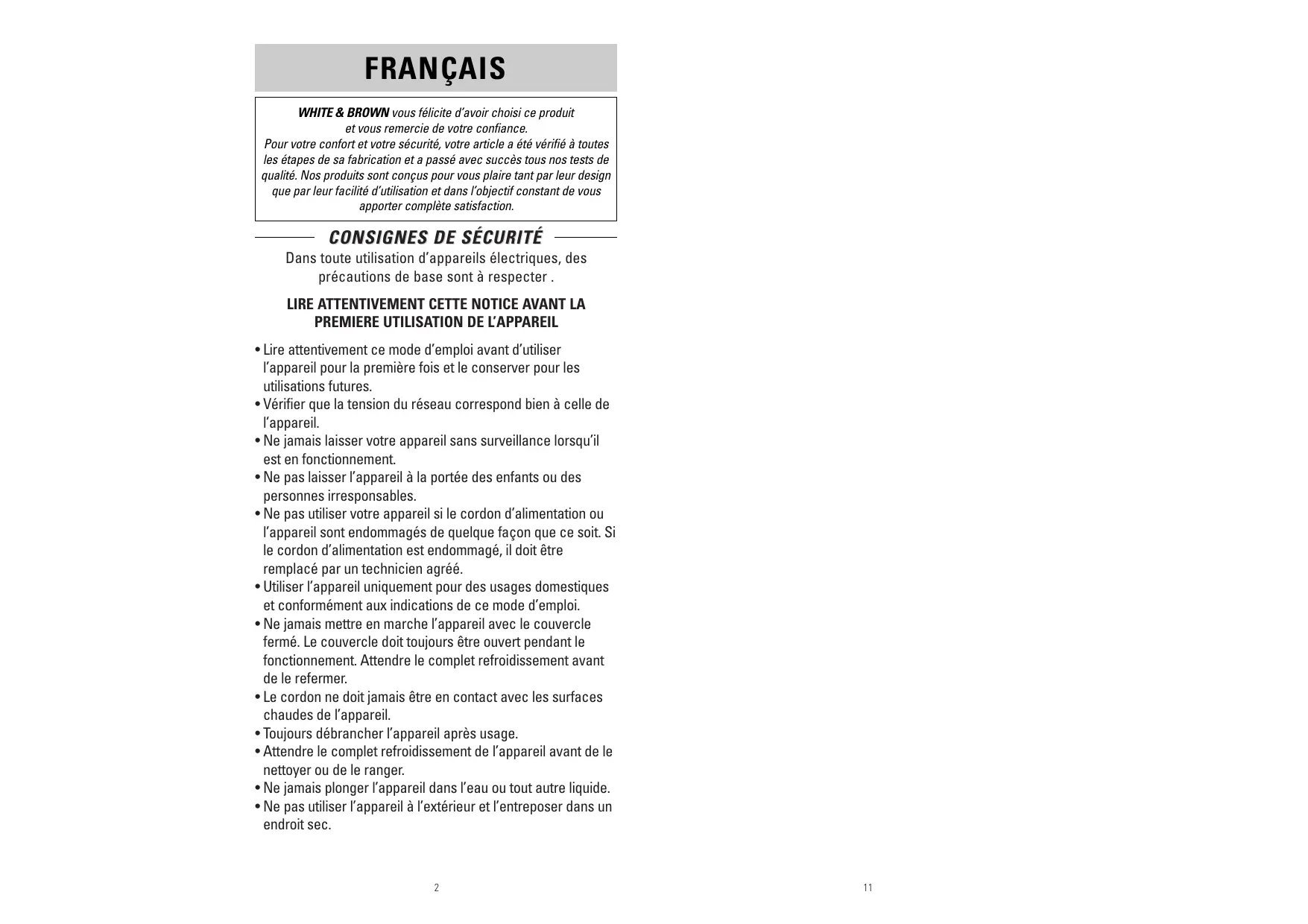 WHITE & BROWN vous remercie d'avoir besoin de ce produit et vous remercie de votre confiance.