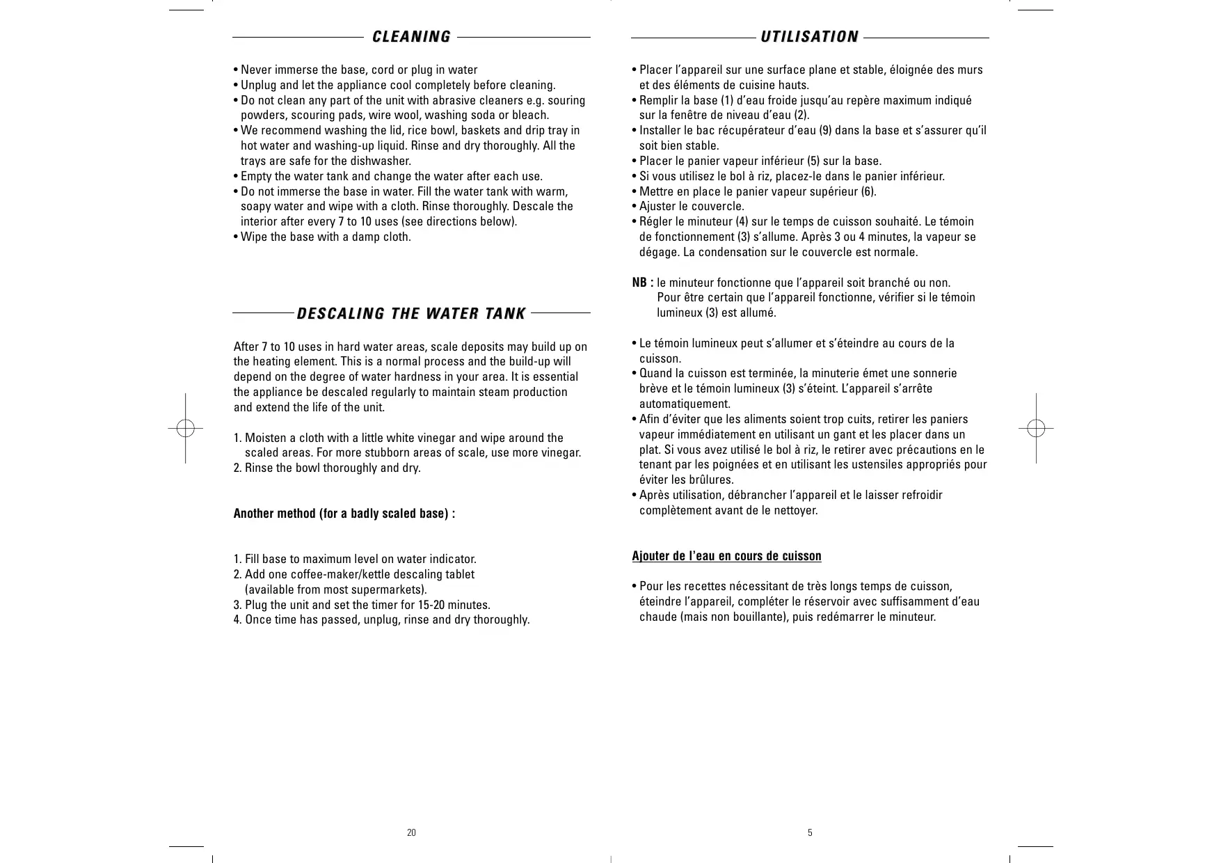 - Tous les temps indiqués dans les tableaux ci-après sont basés sur une utilisation avec de l'eau froide. Pour réduire légèrement ces temps de cuisson, on peut utiliser de l'eau chaude (mais pas bouillante).