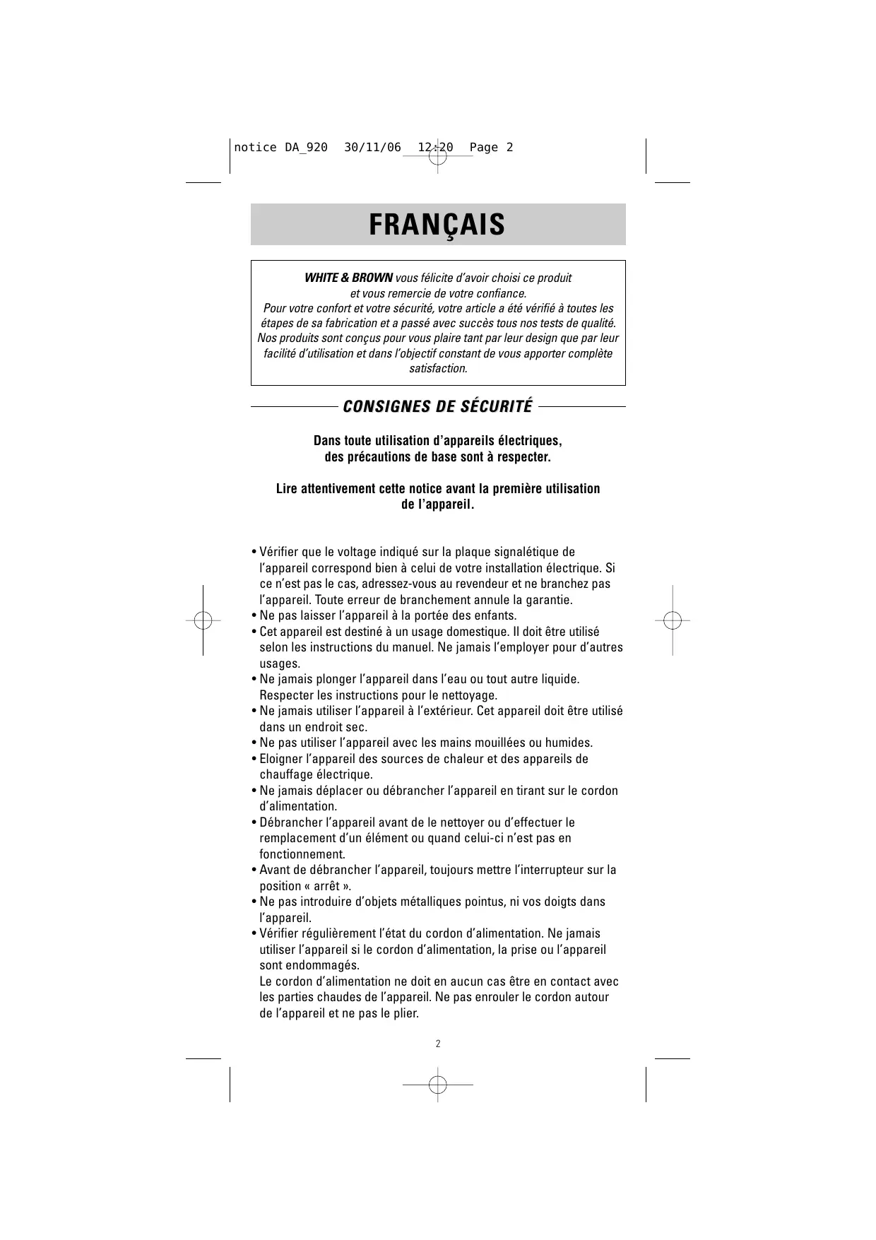 MODE D'EMPLOI DA 920 WHITE & BROWN