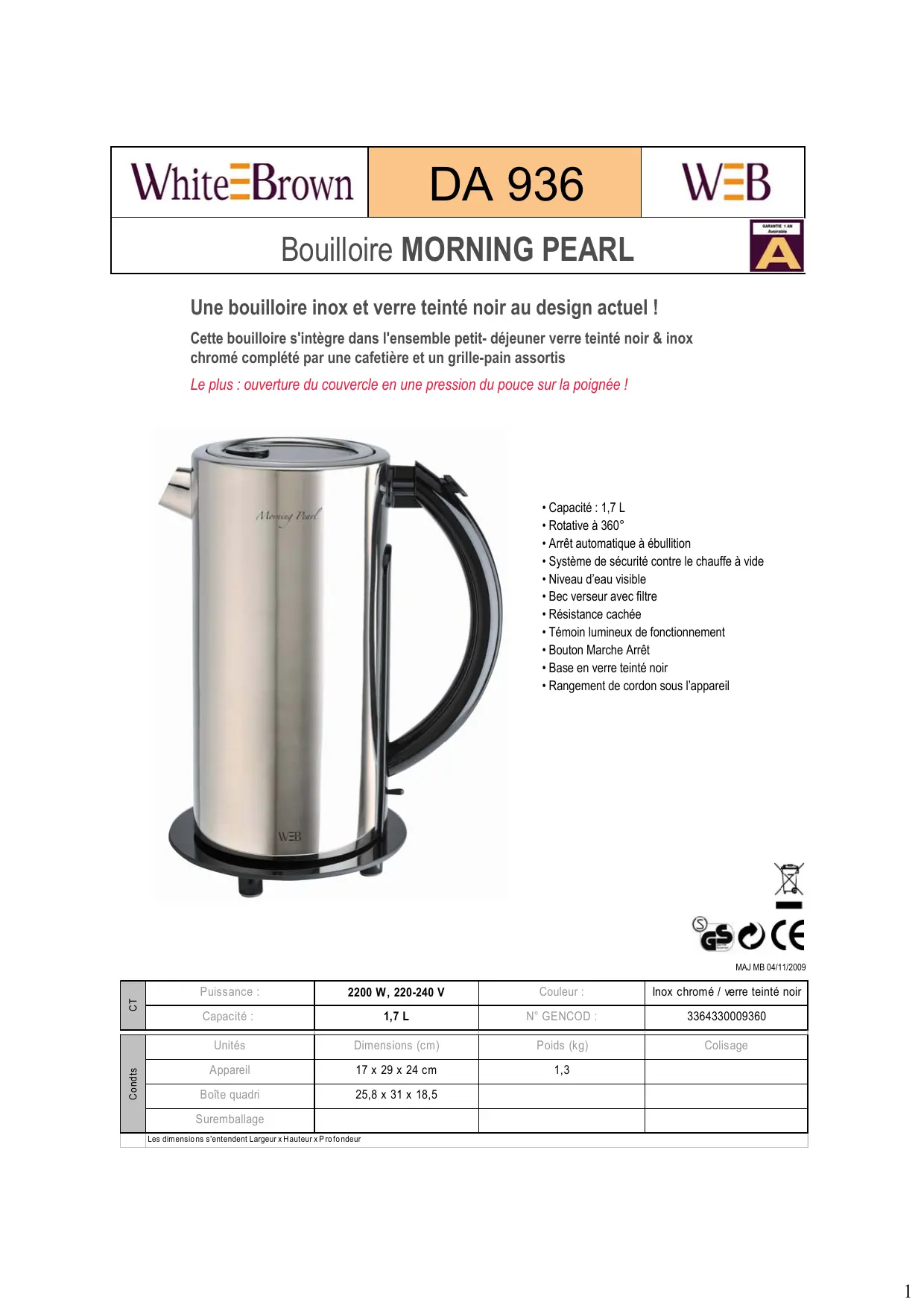 DA 936 - Bouilloire électrique WHITE & BROWN - Notice d'utilisation et mode d'emploi gratuit