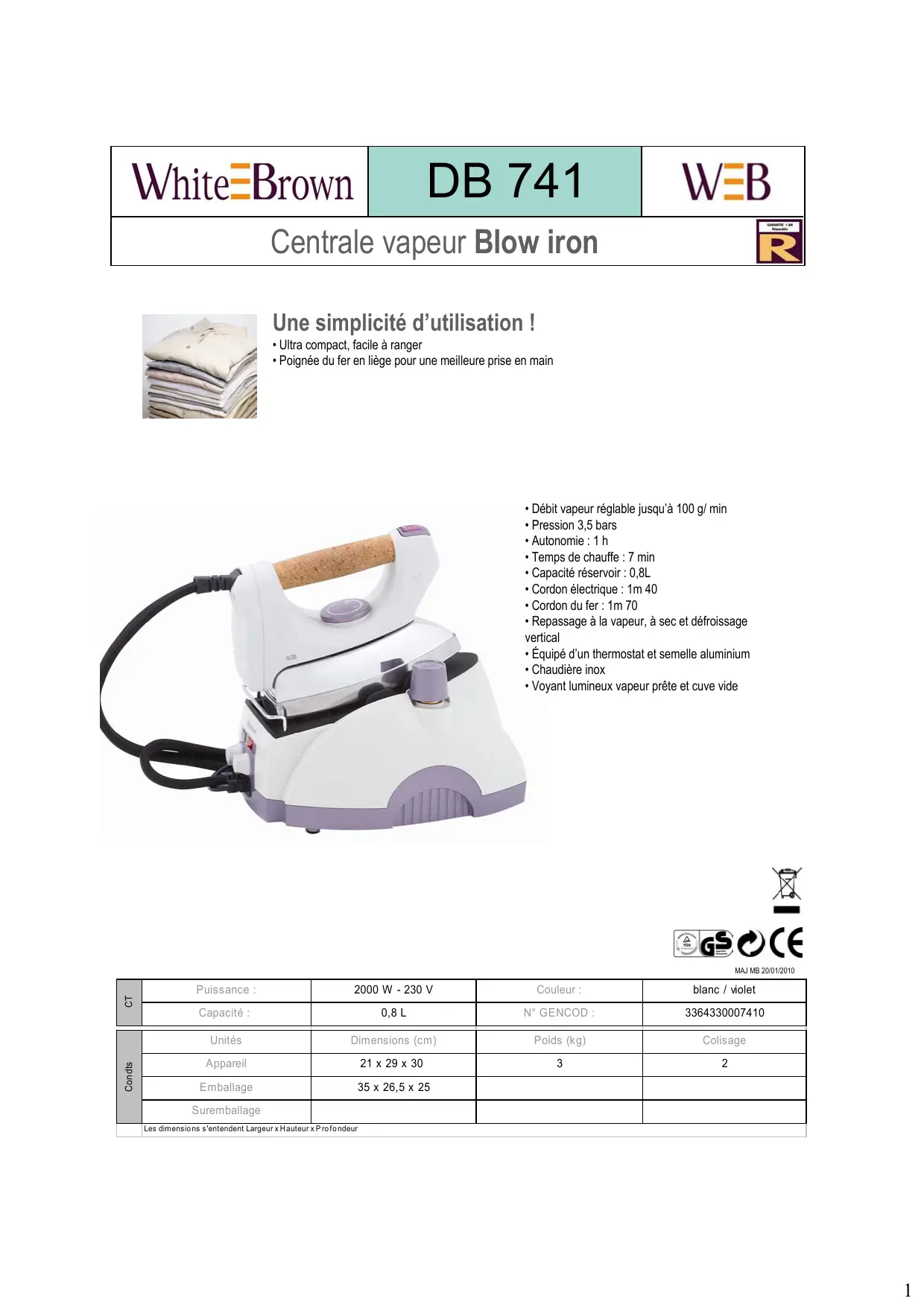 MAJ MB 20/01/2010 Puissance : 2000 W - 230 V Couleur : blanc / violet Capacité : 0,8 L N° GENCOD :