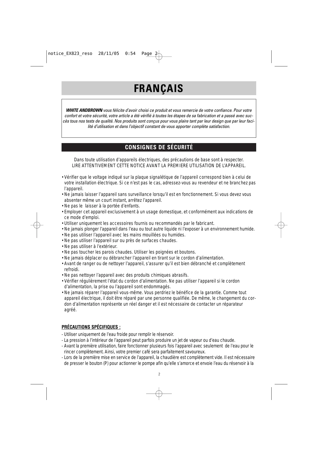 EX 823 - Machine à café WHITE & BROWN - Notice d'utilisation et mode d'emploi gratuit