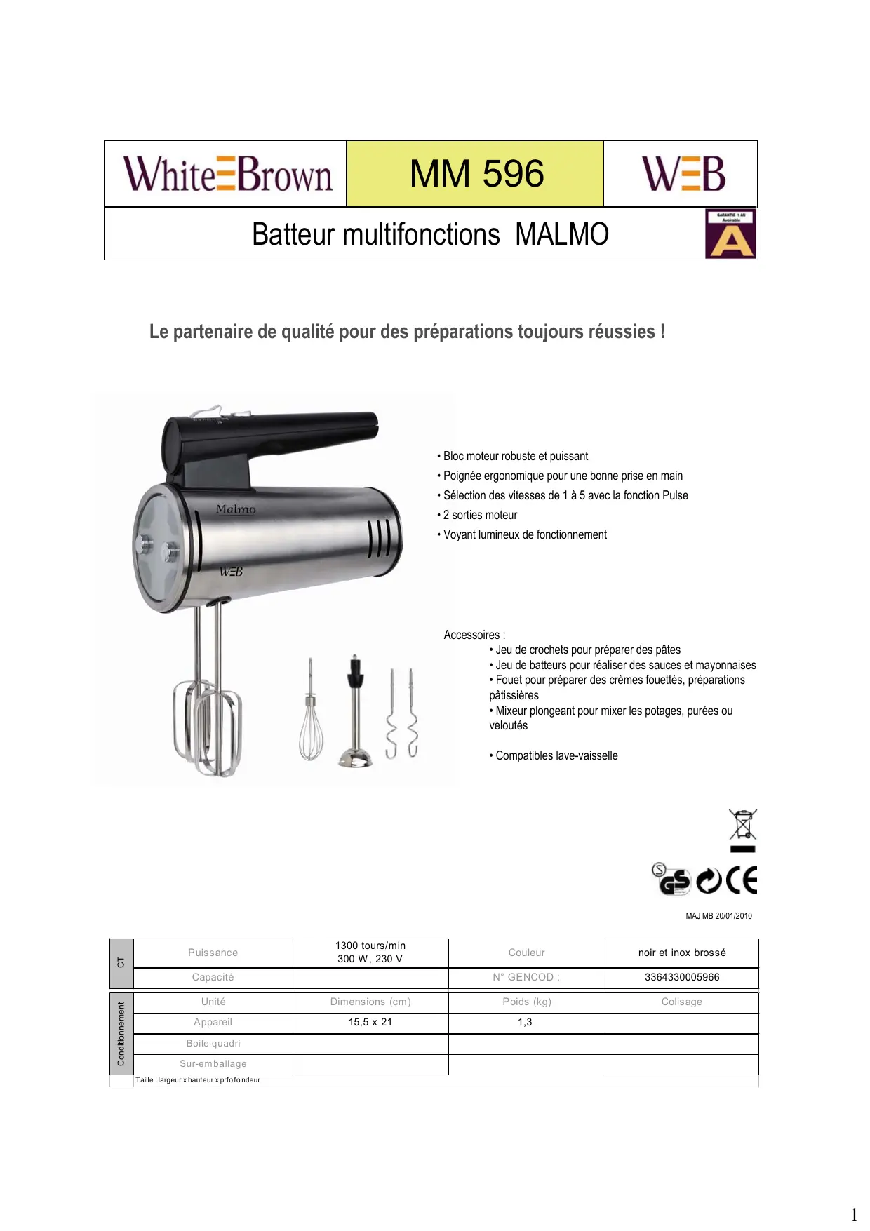 Téléchargez la notice de votre Batteur électrique au format PDF gratuitement ! Retrouvez votre notice MM 596 - WHITE & BROWN et reprennez votre appareil électronique en main. Sur cette page sont publiés tous les documents nécessaires à l'utilisation de votre appareil MM 596 de la marque WHITE & BROWN.