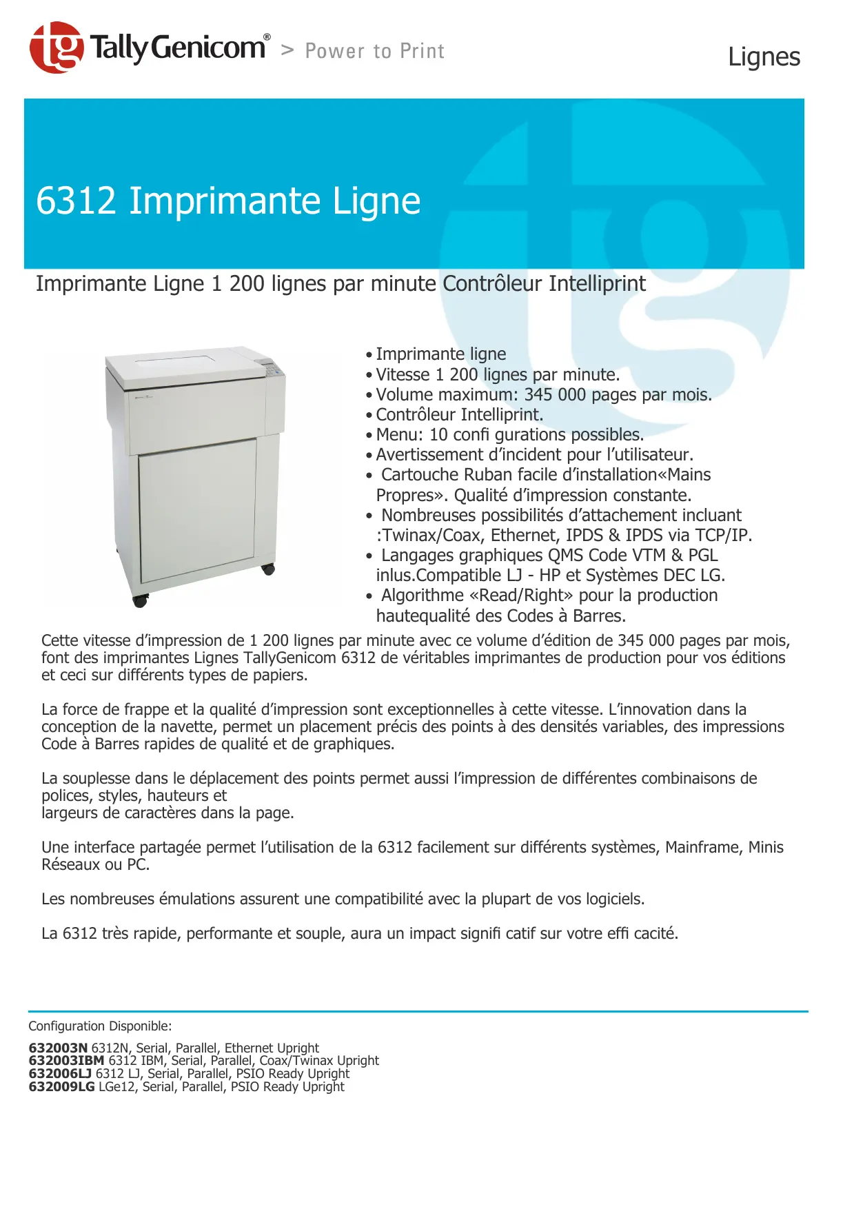 Lignes 6312 Imprimante Ligne Imprimante Ligne 1 200 lignes par minute Contrôleur Intelliprint Imprimante ligne Vitesse 1 200 lignes par minute. Volume maximum: 345 000 pages par mois. Contrôleur Intelliprint. Menu: 10 confi gurations possibles. Avertissement d’incident pour l’utilisateur. Cartouche Ruban facile d’installation«Mains Propres». Qualité d’impression constante. Nombreuses possibilités d’attachement incluant :Twinax/Coax, Ethernet, IPDS & IPDS via TCP/IP. Langages graphiques QMS Code VTM & PGL inlus.Compatible LJ - HP et Systèmes DEC LG. Algorithme «Read/Right» pour la production hautequalité des Codes à Barres. Cette vitesse d’impression de 1 200 lignes par minute avec ce volume d’édition de 345 000 pages par mois, font des imprimantes Lignes TallyGenicom 6312 de véritables imprimantes de production pour vos éditions et ceci sur différents types de papiers. La force de frappe et la qualité d’impression sont exceptionnelles à cette vitesse. L’innovation dans la conception de la navette, permet un placement précis des points à des densités variables, des impressions Code à Barres rapides de qualité et de graphiques. La souplesse dans le déplacement des points permet aussi l’impression de différentes combinaisons de polices, styles, hauteurs et largeurs de caractères dans la page. Une interface partagée permet l’utilisation de la 6312 facilement sur différents systèmes, Mainframe, Minis Réseaux ou PC. Les nombreuses émulations assurent une compatibilité avec la plupart de vos logiciels. La 6312 très rapide, performante et souple, aura un impact signifi catif sur votre effi cacité. Configuration Disponible: 632003N 6312N, Serial, Parallel, Ethernet Upright 632003IBM 6312 IBM, Serial, Parallel, Coax/Twinax Upright 632006LJ 6312 LJ, Serial, Parallel, PSIO Ready Upright 632009LG LGe12, Serial, Parallel, PSIO Ready Upright Spécificités 6312 Imprimante Ligne Vitesse d'impression 1200 LPM (texte); 150 IPM (graphique) Technologie d'Impression Ligne à Impact Résolution 240 x 288 (H x V) Espacement de caractères 5, 6, 6.7, 7.5, 8.3, 8.6, 10, 12, 13.3, 15, 16.7, 17.1, 20 Interligne 1.5, 2, 3, 4, 5, 6, 8, 9, 10, 12 (plus variable line spacing) Mémoire 32Mb Interfaces Standard Parallèle IEEE 1284, série RS 232.(38 400 bauds) partage dynamique. Emulation Standard Tally® ANSI, GENICOM® ANSI, Printronix® P600 / P5000/ P6000, DEC® LG01, HP2564C, IBM® Proprinter, Epson® FX1180 Emulation Optionnelles IPDS, IBM Twinax / IBM Coax, LANPlex Module Adds Ethernet 10BASE-T / Ethernet 100BASE-T Polices Draft, Data Processing, Courier, Gothic, OCR A & B Consommables 40, 60, 250 millions de caractères. Capacité papier standard Auto-Gap Epaisseur Jusqu’à 6 exemplaires, épaisseur maximum Type de papier Continu Listing Poids papier 60 - 375 gr. Taille papier Taille papier: Largeur: 3"- 18,7", Longueur: 1 - 255 lignes. Poids Table Top 53Kg - Pedestal 73Kg Dimension Model Pied Fermé (H)x(L)x(P): 40"x28,5"x23,5" Alimentation électrique 90 - 130/180 - 264V, 50/60 Hz. Frequence 50/60 Hz Volume d'impression 175 000 mensuel MTBF NA Drivers NA Température 10°C à 40°C(en fonction), 40°C à 66°C (en stockage). Environnement 10 à 90% non condensée (en foctionnement), 5°C à 95°Cnon condensée (en stockage). Niveau sonore Table Top 60 dB(A) - Pied Ouvert 60 dB(A) - Pied Fermé 56 dB(A) Garantie standard 3 mois sur site. Notification Exceeding the monthly duty cycle will not void the warranty if TallyGenicom consumables and maintenance kits are used. © 2009 Printronix, Inc. All rights reserved. Genicom, Tally, TallyGenicom, TG TallyGenicom, the TG Logo, Intellifilter, Intelliprint and Intellipress are trademarks or registered trademarks of Printronix, Inc. Microsoft, Windows, and the Windows logo are trademarks or registered trademarks of Microsoft Corporation in the United States and/or other countries. All other trademarks, product names, company names or logos herein are the property of their respective owners. Product appearance and/or specifications are subject to change without notice. Printed Date: 16/05/2009 PRINTRONIX France Sarl 13 Rue Salomon de Rothschild 92150 Suresnes, France Tel: +33 (0) 1 46 25 19 00 www.tallygenicom.com emeasales@printronix.com