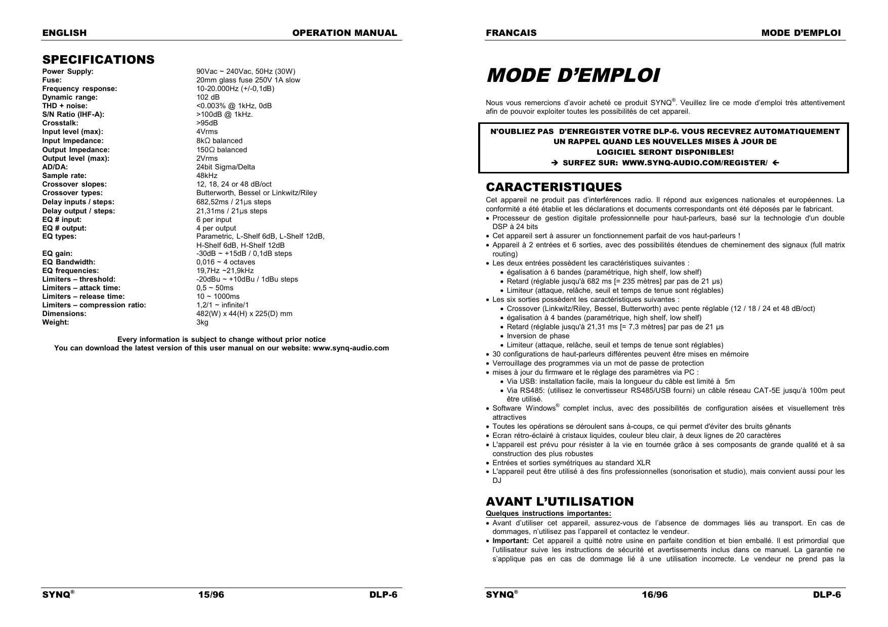 SYNQ° 15/96 DLP-6 CARACTERISTIQUES Cet appareil ne produit pas d'interférences radio. Il répond aux exigences nationales et européennes. La conformité a été établie et les déclarations et documents correspondants ont été déposés par le fabricant. + Processeur de gestion digitale professionnelle pour haut-parleurs, basé sur la technologie d'un double DSP à 24 bits + Cet appareil sert à assurer un fonctionnement parfait de vos haut-parleurs ! Appareil à 2 entrées et 6 sorties, avec des possibilités étendues de cheminement des signaux (full matrix routing) Les deux entrées possèdent les caractéristiques suivantes : + égalisation à 6 bandes (paramétrique, high shelf, low shelf) + Retard (réglable jusqu'à 682 ms [= 235 mètres] par pas de 21 us) + Limiteur (attaque, relâche, seuil et temps de tenue sont réglables) Les six sorties possèdent les caractéristiques suivantes : + Crossover (Linkwitz/Riley, Bessel, Butterworth) avec pente réglable (12 / 18 / 24 et 48 dB/oct) + égalisation à 4 bandes (paramétrique, high shelf, low shelf) + Retard (réglable jusqu'à 21,31 ms [= 7,3 mètres] par pas de 21 us + Inversion de phase + Limiteur (attaque, relâche, seuil et temps de tenue sont réglables) 30 configurations de haut-parleurs différentes peuvent être mises en mémoire Verrouillage des programmes via un mot de passe de protection mises à jour du firmware et le réglage des paramètres via PC + Via USB: installation facile, mais la longueur du câble est limité à 5m + Via RS485: (utilisez le convertisseur RS485/USB fourni) un câble réseau CAT-5E jusqu'à 100m peut être utilisé. Software Windows® complet inclus, avec des possibilités de configuration aisées et visuellement très attractives Toutes les opérations se déroulent sans à-coups, ce qui permet d'éviter des bruits gênants Ecran rétro-éclairé à cristaux liquides, couleur bleu clair, à deux lignes de 20 caractères L'appareil est prévu pour résister à la vie en touée grâce à ses composants de grande qualité et à sa construction des plus robustes Entrées et sorties symétriques au standard XLR L'appareil peut être utilisé à des fins professionnelles (sonorisation et studio), mais convient aussi pour les: