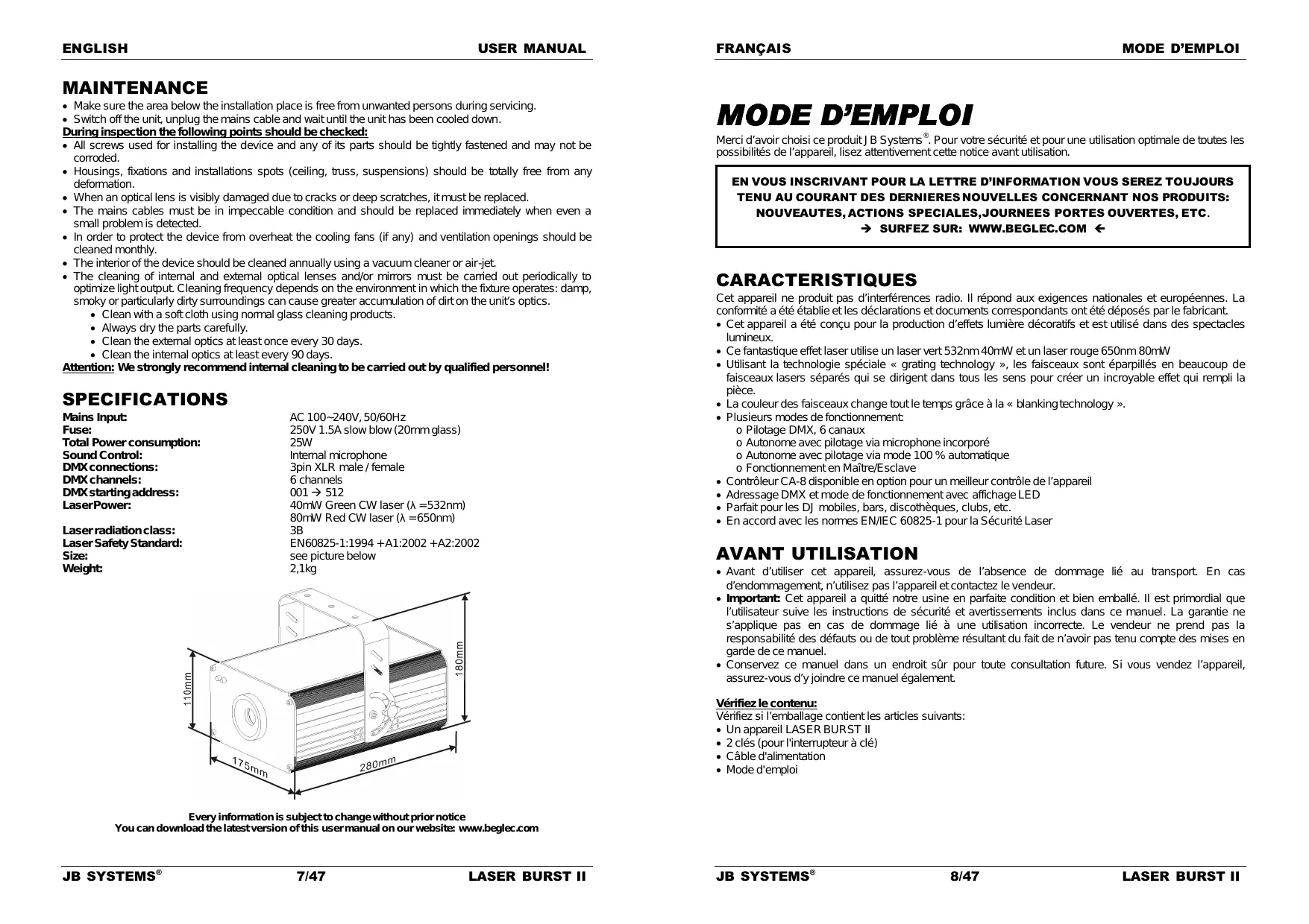 CARACTERISTIQUES Cet appareil ne produit pas d’interférences radio. Il répond aux exigences nationales et européennes. La conformité a été établie et les déclarations et documents correspondants ont été déposés par le fabricant. Cet appareil a été conçu pour la production d’effets lumière décoratifs et est utilisé dans des spectacles lumineux. Ce fantastique effet laser utilise un laser vert 532nm 40mW et un laser rouge 650nm 80mW Utilisant la technologie spéciale « grating technology », les faisceaux sont éparpillés en beaucoup de faisceaux lasers séparés qui se dirigent dans tous les sens pour créer un incroyable effet qui rempli la pièce. La couleur des faisceaux change tout le temps grâce à la « blanking technology ». Plusieurs modes de fonctionnement: o Pilotage DMX, 6 canaux o Autonome avec pilotage via microphone incorporé o Autonome avec pilotage via mode 100 % automatique o Fonctionnement en Maître/Esclave Contrôleur CA-8 disponible en option pour un meilleur contrôle de l’appareil Adressage DMX et mode de fonctionnement avec affichage LED Parfait pour les DJ mobiles, bars, discothèques, clubs, etc. En accord avec les normes EN/IEC 60825-1 pour la Sécurité Laser AVANT UTILISATION Avant d’utiliser cet appareil, assurez-vous de l’absence de dommage lié au transport. En cas d’endommagement, n’utilisez pas l’appareil et contactez le vendeur. Important: Cet appareil a quitté notre usine en parfaite condition et bien emballé. Il est primordial que l’utilisateur suive les instructions de sécurité et avertissements inclus dans ce manuel. La garantie ne s’applique pas en cas de dommage lié à une utilisation incorrecte. Le vendeur ne prend pas la responsabilité des défauts ou de tout problème résultant du fait de n’avoir pas tenu compte des mises en garde de ce manuel. Conservez ce manuel dans un endroit sûr pour toute consultation future. Si vous vendez l’appareil, assurez-vous d’y joindre ce manuel également. Vérifiez le contenu: Vérifiez si l’emballage contient les articles suivants: Un appareil LASER BURST II 2 clés (pour l'interrupteur à clé) Câble d'alimentation Mode d'emploi Every information is subject to change without prior notice You can download the latest version of this user manual on our website: www.beglec.com JB SYSTEMS® 7/47