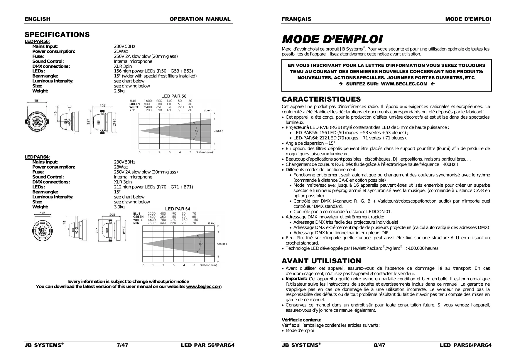 MODE D'EMPLOI LED PAR 64 BEGLEC