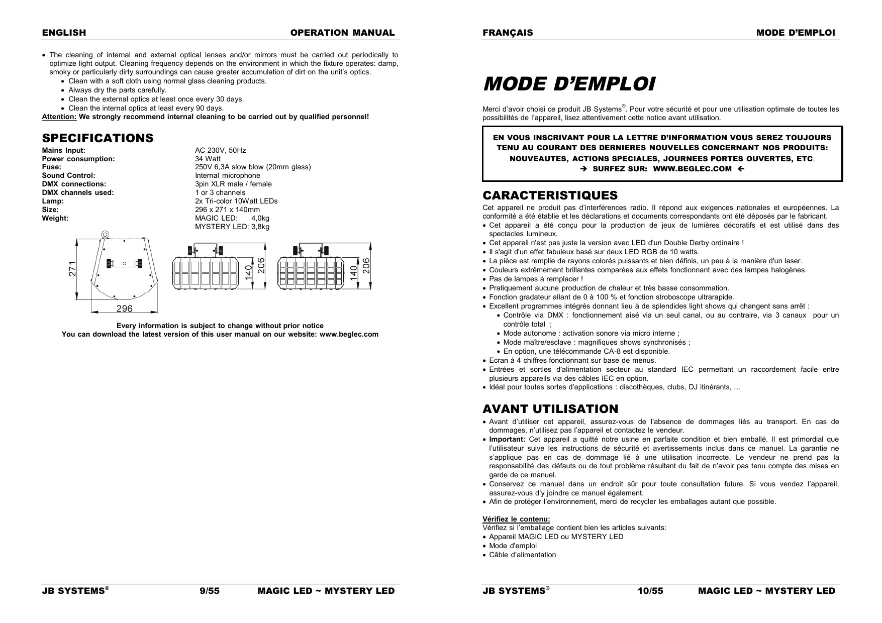 CARACTERISTIQUES Cet appareil ne produit pas d’interférences radio. Il répond aux exigences nationales et européennes. La conformité a été établie et les déclarations et documents correspondants ont été déposés par le fabricant. Cet appareil a été conçu pour la production de jeux de lumières décoratifs et est utilisé dans des spectacles lumineux. Cet appareil n'est pas juste la version avec LED d'un Double Derby ordinaire ! Il s'agit d'un effet fabuleux basé sur deux LED RGB de 10 watts. La pièce est remplie de rayons colorés puissants et bien définis, un peu à la manière d'un laser. Couleurs extrêmement brillantes comparées aux effets fonctionnant avec des lampes halogènes. Pas de lampes à remplacer ! Pratiquement aucune production de chaleur et très basse consommation. Fonction gradateur allant de 0 à 100 % et fonction stroboscope ultrarapide. Excellent programmes intégrés donnant lieu à de splendides light shows qui changent sans arrêt : Contrôle via DMX : fonctionnement aisé via un seul canal, ou au contraire, via 3 canaux pour un contrôle total ; Mode autonome : activation sonore via micro interne ; Mode maître/esclave : magnifiques shows synchronisés ; En option, une télécommande CA-8 est disponible. Ecran à 4 chiffres fonctionnant sur base de menus. Entrées et sorties d'alimentation secteur au standard IEC permettant un raccordement facile entre plusieurs appareils via des câbles IEC en option. Idéal pour toutes sortes d'applications : discothèques, clubs, DJ itinérants, … AVANT UTILISATION Avant d’utiliser cet appareil, assurez-vous de l’absence de dommages liés au transport. En cas de dommages, n’utilisez pas l’appareil et contactez le vendeur. Important: Cet appareil a quitté notre usine en parfaite condition et bien emballé. Il est primordial que l’utilisateur suive les instructions de sécurité et avertissements inclus dans ce manuel. La garantie ne s’applique pas en cas de dommage lié à une utilisation incorrecte. Le vendeur ne prend pas la responsabilité des défauts ou de tout problème résultant du fait de n’avoir pas tenu compte des mises en garde de ce manuel. Conservez ce manuel dans un endroit sûr pour toute consultation future. Si vous vendez l’appareil, assurez-vous d’y joindre ce manuel également. Afin de protéger l’environnement, merci de recycler les emballages autant que possible. Vérifiez le contenu: Vérifiez si l’emballage contient bien les articles suivants: Appareil MAGIC LED ou MYSTERY LED Mode d'emploi Câble d’alimentation JB SYSTEMS® 9/55 ATTENTION: afin de réduire le risque d’électrocution, n’enlevez jamais le couvercle de l’appareil. Il n’y a aucune pièce à l’intérieur de l’appareil que vous puissiez remplacer vous-même. Confiez l’entretien uniquement à des techniciens qualifiés. La flèche dans un triangle met l'utilisateur en garde contre la présence de haute tension sans isolation dans l'appareil, ce qui peut causer un risque d'électrocution. Un point d'exclamation dans un triangle prévient de la présence d'instructions relatives au fonctionnement et à la maintenance se trouvant dans le manuel fourni avec l'appareil. Ce symbole signifie: uniquement pour usage à l'intérieur. Ce symbole signifie : Lire le mode d’emploi. Ce symbole signifie: appareil construit selon les normes de sécurité classe I FRANÇAIS