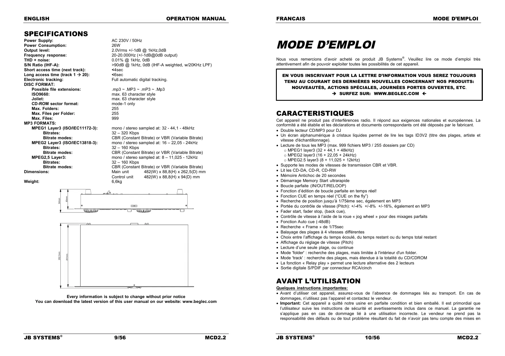 CARACTERISTIQUES TECHNIQUES Alimentation: Consommation: Niveau de sortie: Réponse de fréquence: Distorsion Harmonique + bruit: Rapport Signal/Bruit (IHF-A): Temps d’accès court plage suivante: Temps d’accès long (plage 1 20): Tracking électronique: FORMAT DISQUE: Extensions possibles: ISO9660: Joliet: CD-ROM sector format: Max. Dossiers: Max. Fichiers par dossier: Max. Fichiers: FORMATS MP3: MPEG1 Layer3 (ISO/IEC11172-3): Bit rates: Bitrate modes: MPEG2 Layer3 (ISO/IEC13818-3): Bitrates: Bitrate modes: MPEG2,5 Layer3: Bitrates: Bitrate modes: Dimensions: Poids: EERSTE INGEBRUIKNAME Chacune de ces informations peut être modifiée sans avertissement préalable. Vous pouvez télécharger la dernière version de ce mode d’emploi de notre site Web: www.beglec.com JB SYSTEMS® 19/56 MCD2.2