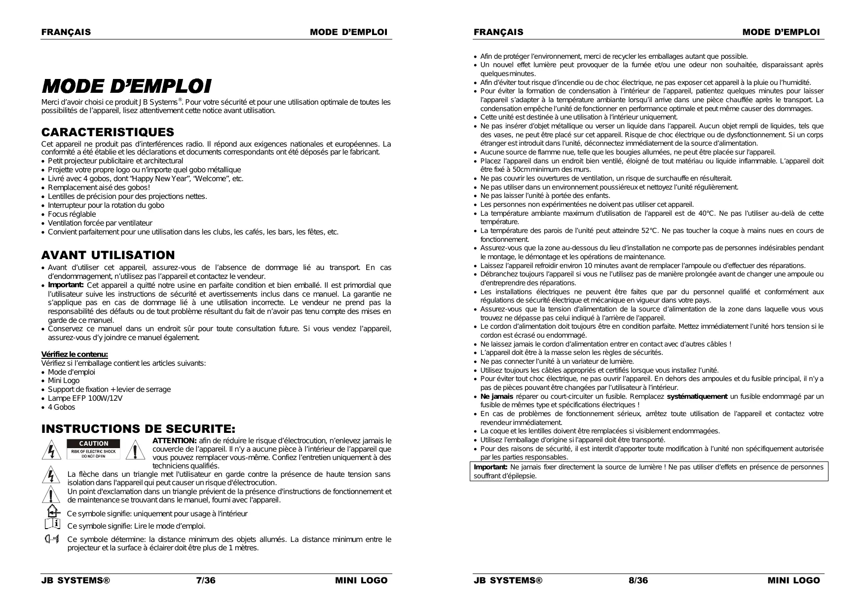 Merci d’avoir choisi ce produit JB Systems®. Pour votre sécurité et pour une utilisation optimale de toutes les possibilités de l’appareil, lisez attentivement cette notice avant utilisation. CARACTERISTIQUES Cet appareil ne produit pas d’interférences radio. Il répond aux exigences nationales et européennes. La conformité a été établie et les déclarations et documents correspondants ont été déposés par le fabricant. Petit projecteur publicitaire et architectural Projette votre propre logo ou n’importe quel gobo métallique Livré avec 4 gobos, dont “Happy New Year”, “Welcome”, etc. Remplacement aisé des gobos! Lentilles de précision pour des projections nettes. Interrupteur pour la rotation du gobo Focus réglable Ventilation forcée par ventilateur Convient parfaitement pour une utilisation dans les clubs, les cafés, les bars, les fêtes, etc. AVANT UTILISATION Avant d’utiliser cet appareil, assurez-vous de l’absence de dommage lié au transport. En cas d’endommagement, n’utilisez pas l’appareil et contactez le vendeur. Important: Cet appareil a quitté notre usine en parfaite condition et bien emballé. Il est primordial que l’utilisateur suive les instructions de sécurité et avertissements inclus dans ce manuel. La garantie ne s’applique pas en cas de dommage lié à une utilisation incorrecte. Le vendeur ne prend pas la responsabilité des défauts ou de tout problème résultant du fait de n’avoir pas tenu compte des mises en garde de ce manuel. Conservez ce manuel dans un endroit sûr pour toute consultation future. Si vous vendez l’appareil, assurez-vous d’y joindre ce manuel également. Vérifiez le contenu: Vérifiez si l’emballage contient les articles suivants: Mode d'emploi Mini Logo Support de fixation + levier de serrage Lampe EFP 100W/12V 4 Gobos INSTRUCTIONS DE SECURITE: ATTENTION: afin de réduire le risque d’électrocution, n’enlevez jamais le couvercle de l’appareil. Il n’y a aucune pièce à l’intérieur de l’appareil que vous pouvez remplacer vous-même. Confiez l’entretien uniquement à des techniciens qualifiés. La flèche dans un triangle met l'utilisateur en garde contre la présence de haute tension sans isolation dans l'appareil qui peut causer un risque d'électrocution. Un point d'exclamation dans un triangle prévient de la présence d'instructions de fonctionnement et de maintenance se trouvant dans le manuel, fourni avec l'appareil. CAUTION FRANÇAIS