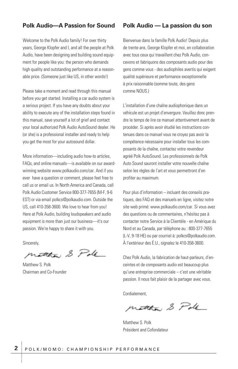 Polk Audio—A Passion for Sound Polk Audio — La passion du son Welcome to the Polk Audio family! For over thirty years, George Klopfer and I, and all the people at Polk Audio, have been designing and building sound equipment for people like you: the person who demands high quality and outstanding performance at a reason- Bienvenue dans la famille Polk Audio! Depuis plus de trente ans, George Klopfer et moi, en collaboration avec tous ceux qui travaillent chez Polk Audio, concevons et fabriquons des composants audio pour des gens comme vous - des audiophiles avertis qui exigent qualité supérieure et performance exceptionnelle à prix raisonnable (somme toute, des gens comme NOUS.) able price. (Someone just like US, in other words!) Please take a moment and read through this manual before you get started. Installing a car audio system is a serious project. If you have any doubts about your ability to execute any of the installation steps found in this manual, save yourself a lot of grief and contact your local authorized Polk Audio AutoSound dealer. He (or she) is a professional installer and ready to help you get the most for your autosound dollar. More information—including audio how-to articles, FAQs, and online manuals—is available on our awardwinning website www.polkaudio.com/car. And if you ever have a question or comment, please feel free to call us or email us. In North America and Canada, call Polk Audio Customer Service 800-377-7655 (M-F, 9-6 EST) or via email polkcs@polkaudio.com. Outside the US, call 410-358-3600. We love to hear from you! Here at Polk Audio, building loudspeakers and audio equipment is more than just our business—it's our passion. We're happy to share it with you. L’installation d’une chaîne audiophonique dans un véhicule est un projet d’envergure. Veuillez donc prendre le temps de lire ce manuel attentivement avant de procéder. Si après avoir étudié les instructions contenues dans ce manuel vous ne croyez pas avoir la compétence nécessaire pour installer tous les composants de la chaîne, contactez votre revendeur agréé Polk AutoSound. Les professionnels de Polk Auto Sound sauront installer votre nouvelle chaîne selon les règles de l’art et vous permettront d’en profiter au maximum. Pour plus d’information – incluant des conseils pratiques, des FAQ et des manuels en ligne, visitez notre site web primé: www.polkaudio.com/car. Si vous avez des questions ou de commentaires, n’hésitez pas à contacter notre Service à la Clientèle - en Amérique du Nord et au Canada, par téléphone au : 800-377-7655 (L-V, 9-18 HE) ou par courriel à: polkcs@polkaudio.com. Sincerely, À l’extérieur des É.U., signalez le 410-358-3600. Matthew S. Polk Chairman and Co-Founder Chez Polk Audio, la fabrication de haut-parleurs, d’enceintes et de composants audio est beaucoup plus qu’une entreprise commerciale – c’est une véritable passion. Il nous fait plaisir de la partager avec vous. Cordialement, Matthew S. Polk Président and Cofondateur