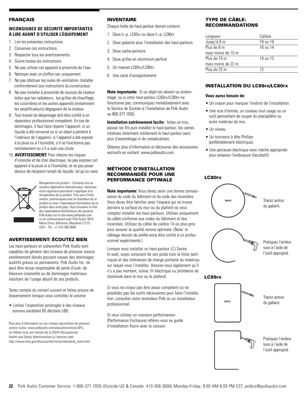 Note importante: Si un objet est absent ou endommagé, ou si votre haut-parleur LC65FX/LC80FX ne fonctionne pas, communiquez immédiatement avec le Service de Soutien à l’Installation de Polk Audio au 800-377-7655. Installation extrêmement facile: faites un trou, passez les fils puis installez le haut-parleur; les cames rotatives retiennent solidement le haut-parleur sans plus d'assemblage ni de complications. Obtenez plus d’information et découvrez des accessoires exclusifs en visitant: www.polkaudio.com.