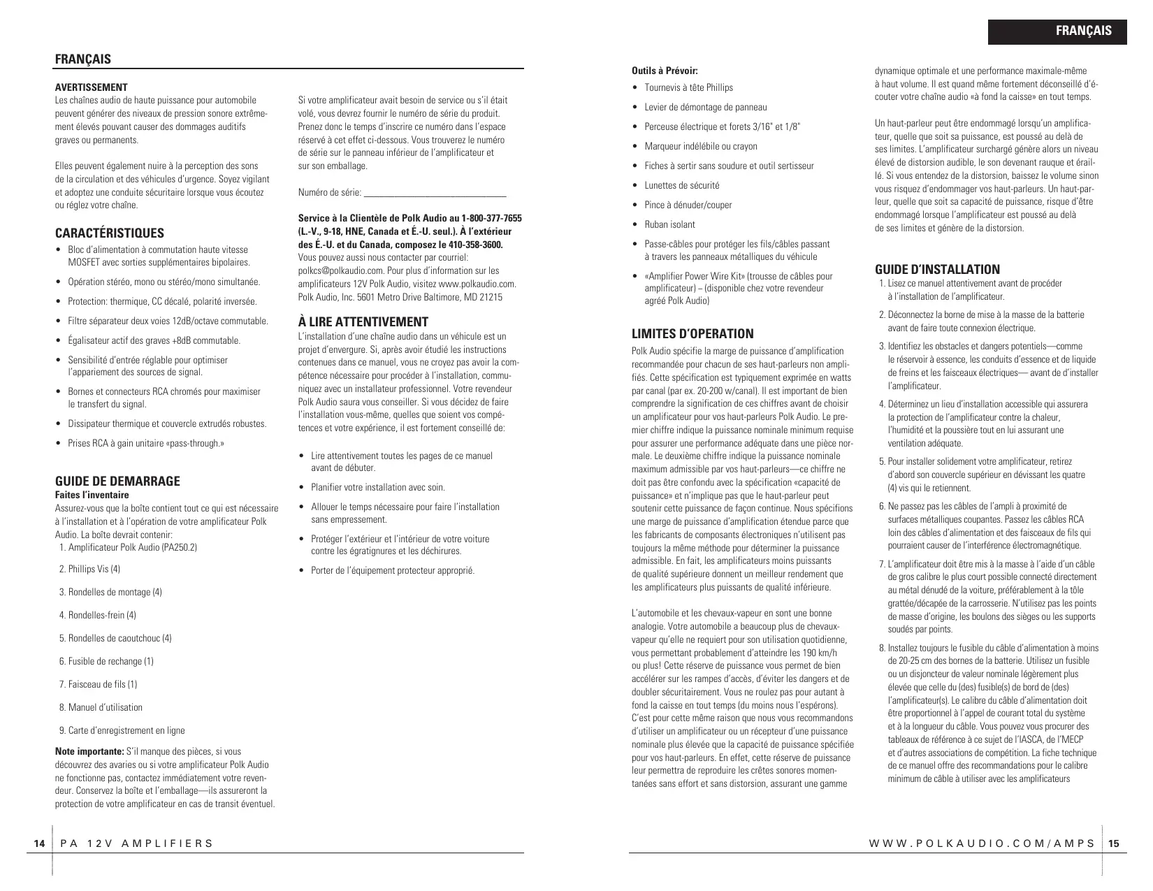 ENGLISH FRANÇAIS Polk Audio—A Passion for Sound Polk Audio—La passion du son Please take a moment and read through this manual before you get started. Installing a car audio system is a serious project. If you have any doubts about your ability to execute any of the installation steps found in this manual, save yourself a lot of grief and contact your local authorized Polk Audio AutoSound dealer. He (or she) is a professional installer and ready to help you get the most for your autosound dollar. L’installation d’une chaîne audiophonique dans un véhicule est un projet d’envergure. Veuillez donc prendre le temps de lire ce manuel attentivement avant de procéder. Si après avoir étudié les instructions contenues dans ce manuel vous ne croyez pas avoir la compétence nécessaire pour installer tous les composants de la chaîne, contactez votre revendeur agréé Polk AutoSound. Les professionnels de Polk Auto Sound sauront installer votre nouvelle chaîne selon les règles de l’art et vous permettront d’en profiter au maximum. More information—including audio how-to articles, FAQs, and online manuals—is available on our award-winning website www.polkaudio.com/car. And if you ever have a question or comment, please feel free to call us or email us. In North America and Canada, call Polk Audio Customer Service 800-377-7655 (M-F, 9-6 EST) or via email polkcs@polkaudio.com. Outside the US, call 410-358-3600. We love to hear from you! Here at Polk Audio, building loudspeakers and audio equipment is more than just our business—it’s our passion. We’re happy to share it with you. Sincerely, Pour plus d’information—incluant des conseils pratiques, des FAQ et des manuels en ligne, visitez notre site web primé: www.polkaudio.com/car. Si vous avez des questions ou de commentaires, n’hésitez pas à contacter notre Service à la Clientèle—en Amérique du Nord et au Canada, par téléphone au: 800-377-7655 (L-V, 9-18 HE) ou par courriel à: polkcs@polkaudio.com. À l’extérieur des É.U., signalez le 410-358-3600. Chez Polk Audio, la fabrication de haut-parleurs, d’enceintes et de composants audio est beaucoup plus qu’une entreprise commerciale—c’est une véritable passion. Il nous fait plaisir de la partager avec vous. Cordialement, Matthew S. Polk Co-Founder Matthew S. Polk Cofondateur