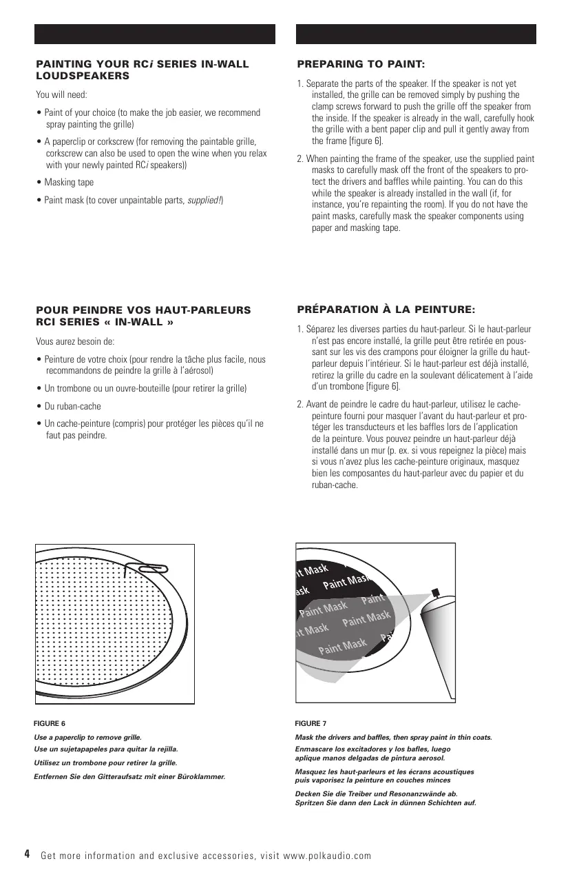 n’est pas encore installé, la grille peut être retirée en poussant sur les vis des crampons pour éloigner la grille du hautparleur depuis l’intérieur. Si le haut-parleur est déjà installé, retirez la grille du cadre en la soulevant délicatement à l’aide d’un trombone [figure 6]. 2. Avant de peindre le cadre du haut-parleur, utilisez le cachepeinture fourni pour masquer l’avant du haut-parleur et protéger les transducteurs et les baffles lors de l’application de la peinture. Vous pouvez peindre un haut-parleur déjà installé dans un mur (p. ex. si vous repeignez la pièce) mais si vous n’avez plus les cache-peinture originaux, masquez bien les composantes du haut-parleur avec du papier et du ruban-cache. FIGURE 6 FIGURE 7 Use a paperclip to remove grille. Mask the drivers and baffles, then spray paint in thin coats. Use un sujetapapeles para quitar la rejilla. Enmascare los excitadores y los bafles, luego aplique manos delgadas de pintura aerosol. Utilisez un trombone pour retirer la grille. Entfernen Sie den Gitteraufsatz mit einer Büroklammer. Masquez les haut-parleurs et les écrans acoustiques puis vaporisez la peinture en couches minces Decken Sie die Treiber und Resonanzwände ab. Spritzen Sie dann den Lack in dünnen Schichten auf. 4 Get more information and exclusive accessories, visit www.polkaudio.com PAINTING THE FRAME: