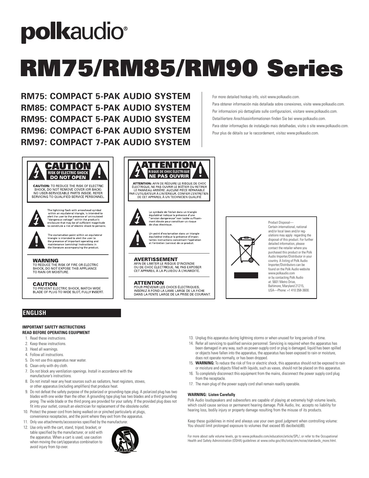 Polk Audio a été fondée à Baltimore en 1972 par deux gradués de l’Université John Hopkins, Matthew Polk et George Klopfer. Aujourd’hui, Polk Audio est un des plus importants fabricants de haut-parleurs pour la maison et l’automobile. Polk Audio détient plus de 50 brevets pour es technologies et ses designs innovateurs; ses produits sont reconnus mondialement pour leur qualité de fabrication et leur sonorité incomparable. Ils sont vendus aux États-Unis, au Canada et dans plus de 50 pays autour du monde. La mission de Polk a toujours été de construire des haut-parleurs de la plus haute qualité - tout en les offrant à prix abordables. Pour ceux et celles qui oeuvrent chez Polk, bâtir des haut-parleurs n’est pas seulement une occupation, c’est une passion. Si après avoir suivi le mode de connexion vous éprouvez des difficultés, vérifier toutes vos connexions. Si le problème semble provenir du haut-parleur, contactez le revendeur Polk agréé de qui vous avez acheté le produit ou communiquez avec le Service à la Clientèle de Polk Audio au 1-800-377-7655 (appels du Canada et des É.U. seulement) du lundi au vendredi, 9h00 - 18h00 HNE.Vous pouvez également communiquer avec nous par courriel: polkcs@polkaudio.com. For performance specifications on the RM Series speakers, visit our website at www.polkaudio.com. Para obter informações sobre as especificações das caixas acústicas da série RM, visite nosso website em www.polkaudio.com. Per i dati tecnici dei diffusori RM visitare il nostro sito web, www.polkaudio.com. For performance specifications on the RM Series speakers, visit our website at www.polkaudio.com. Para ver las especificaciones de los altavoces de la serie RM, visite nuestro sitio Web www.polkaudio.com. For performance specifications on the RM Series speakers, visit our website at www.polkaudio.com.