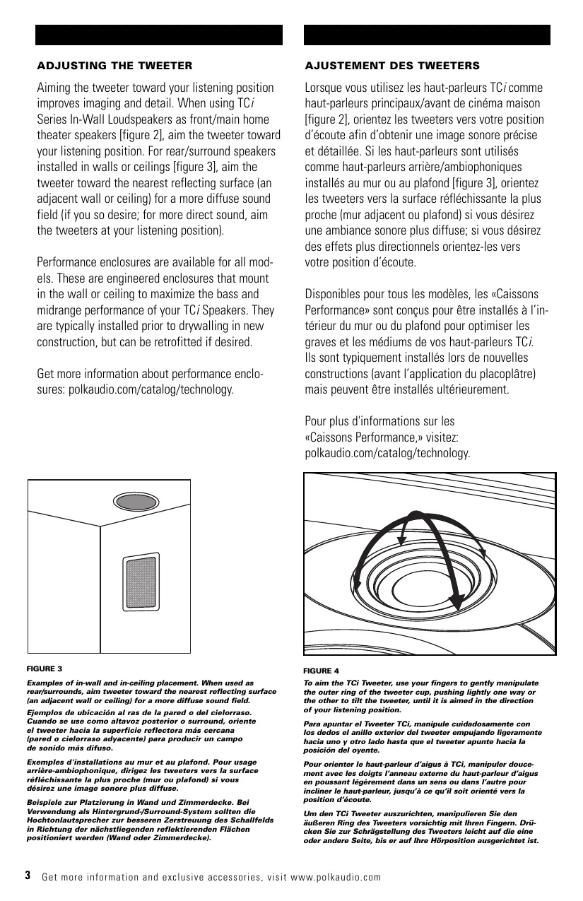 Aiming the tweeter toward your listening position improves imaging and detail. When using TCi Series In-Wall Loudspeakers as front/main home theater speakers [figure 2], aim the tweeter toward your listening position. For rear/surround speakers installed in walls or ceilings [figure 3], aim the tweeter toward the nearest reflecting surface (an adjacent wall or ceiling) for a more diffuse sound field (if you so desire; for more direct sound, aim the tweeters at your listening position). Lorsque vous utilisez les haut-parleurs TCi comme haut-parleurs principaux/avant de cinéma maison [figure 2], orientez les tweeters vers votre position d’écoute afin d’obtenir une image sonore précise et détaillée. Si les haut-parleurs sont utilisés comme haut-parleurs arrière/ambiophoniques installés au mur ou au plafond [figure 3], orientez les tweeters vers la surface réfléchissante la plus proche (mur adjacent ou plafond) si vous désirez une ambiance sonore plus diffuse; si vous désirez des effets plus directionnels orientez-les vers votre position d’écoute. Performance enclosures are available for all models. These are engineered enclosures that mount in the wall or ceiling to maximize the bass and midrange performance of your TCi Speakers. They are typically installed prior to drywalling in new construction, but can be retrofitted if desired. Get more information about performance enclosures: polkaudio.com/catalog/technology. Disponibles pour tous les modèles, les «Caissons Performance» sont conçus pour être installés à l’intérieur du mur ou du plafond pour optimiser les graves et les médiums de vos haut-parleurs TCi. Ils sont typiquement installés lors de nouvelles constructions (avant l’application du placoplâtre) mais peuvent être installés ultérieurement. Pour plus d'informations sur les «Caissons Performance,» visitez: polkaudio.com/catalog/technology. FIGURE 3 FIGURE 4 Examples of in-wall and in-ceiling placement. When used as rear/surrounds, aim tweeter toward the nearest reflecting surface (an adjacent wall or ceiling) for a more diffuse sound field. To aim the TCi Tweeter, use your fingers to gently manipulate the outer ring of the tweeter cup, pushing lightly one way or the other to tilt the tweeter, until it is aimed in the direction of your listening position. Ejemplos de ubicación al ras de la pared o del cielorraso. Cuando se use como altavoz posterior o surround, oriente el tweeter hacia la superficie reflectora más cercana (pared o cielorraso adyacente) para producir un campo de sonido más difuso. Exemples d'installations au mur et au plafond. Pour usage arrière-ambiophonique, dirigez les tweeters vers la surface réfléchissante la plus proche (mur ou plafond) si vous désirez une image sonore plus diffuse. Beispiele zur Platzierung in Wand und Zimmerdecke. Bei Verwendung als Hintergrund-/Surround-System sollten die Hochtonlautsprecher zur besseren Zerstreuung des Schallfelds in Richtung der nächstliegenden reflektierenden Flächen positioniert werden (Wand oder Zimmerdecke). Para apuntar el Tweeter TCi, manipule cuidadosamente con los dedos el anillo exterior del tweeter empujando ligeramente hacia uno y otro lado hasta que el tweeter apunte hacia la posición del oyente. Pour orienter le haut-parleur d’aigus à TCi, manipuler doucement avec les doigts l’anneau externe du haut-parleur d’aigus en poussant légèrement dans un sens ou dans l’autre pour incliner le haut-parleur, jusqu’à ce qu’il soit orienté vers la position d’écoute. Um den TCi Tweeter auszurichten, manipulieren Sie den äußeren Ring des Tweeters vorsichtig mit Ihren Fingern. Drücken Sie zur Schrägstellung des Tweeters leicht auf die eine oder andere Seite, bis er auf Ihre Hörposition ausgerichtet ist. 3 Get more information and exclusive accessories, visit www.polkaudio.com Note: TCi Series In-Wall Loudspeakers are not magnetically shielded and should not be placed closer than 1’ (30cm) from a direct view television or video monitor. Test your distance BEFORE INSTALLATION by simply holding the speaker in the place you plan to install it, and seeing how it affects any TVs or video monitors nearby. If your monitor experiences discoloration or distortion, immediately move the speaker a little farther away. Note: les haut-parleurs TCi ne sont pas blindés et ne devraient pas être installés à moins de 30 cm (1 pi) d’un téléviseur ou d’un écran vidéo. Testez la distance AVANT L’INSTALLATION en tenant simplement le haut-parleur à l’endroit où vous comptez l’installer; vous verrez immédiatement s’il affecte le téléviseur ou le moniteur. Si vous constatez de la distorsion ou de la décoloration vidéo, éloignez immédiatement le haut-parleur de l’écran. DIRECTING THE DRIVER (TC60i & TC80i)