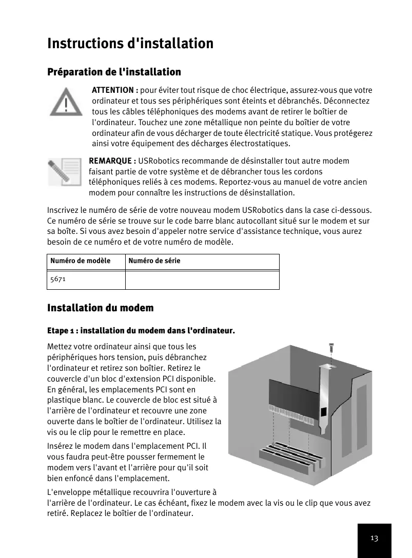 Retrouvez gratuitement la notice de l'appareil 56K PCI FAXMODEM US ROBOTICS au format PDF.