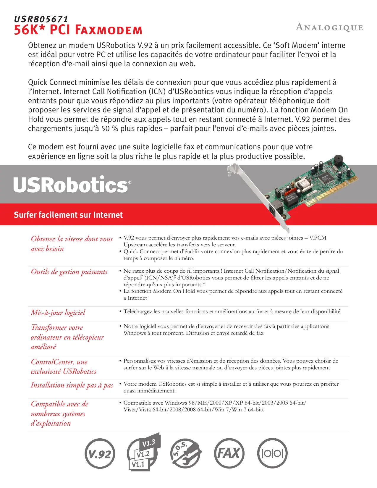 Hold vous permet de répondre aux appels tout en restant connecté à Internet. V.92 permet des chargements jusqu’à 50 % plus rapides – parfait pour l’envoi d’e-mails avec pièces jointes. Ce modem est fourni avec une suite logicielle fax et communications pour que votre expérience en ligne soit la plus riche le plus rapide et la plus productive possible.
