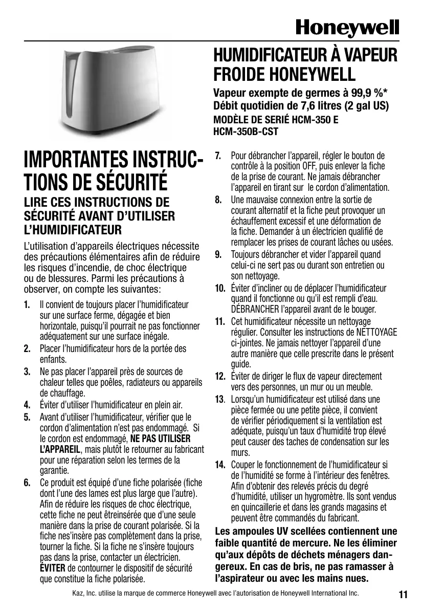 de l’humidité se forme à l’intérieur des fenêtres. Afin d’obtenir des relevés précis du degré d’humidité, utiliser un hygromètre. Ils sont vendus en quincaillerie et dans les grands magasins et peuvent être commandés du fabricant. Les ampoules UV scellées contiennent une faible quantité de mercure. Ne les éliminer qu’aux dépôts de déchets ménagers dangereux. En cas de bris, ne pas ramasser à l’aspirateur ou avec les mains nues. Kaz, Inc. utilise la marque de commerce Honeywell avec l’autorisation de Honeywell International Inc.