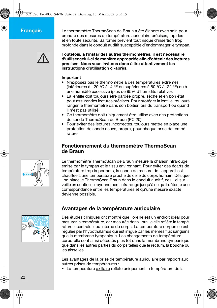 Le thermomètre ThermoScan de Braun a été élaboré avec soin pour prendre des mesures de température auriculaire précises, rapides et en toute sécurité. Sa forme prévient tout risque d’insertion trop profonde dans le conduit auditif susceptible d’endommager le tympan. Toutefois, à l’instar des autres thermomètres, il est nécessaire d’utiliser celui-ci de manière appropriée afin d’obtenir des lectures précises. Nous vous invitons donc à lire attentivement les instructions d’utilisation ci-après. Important