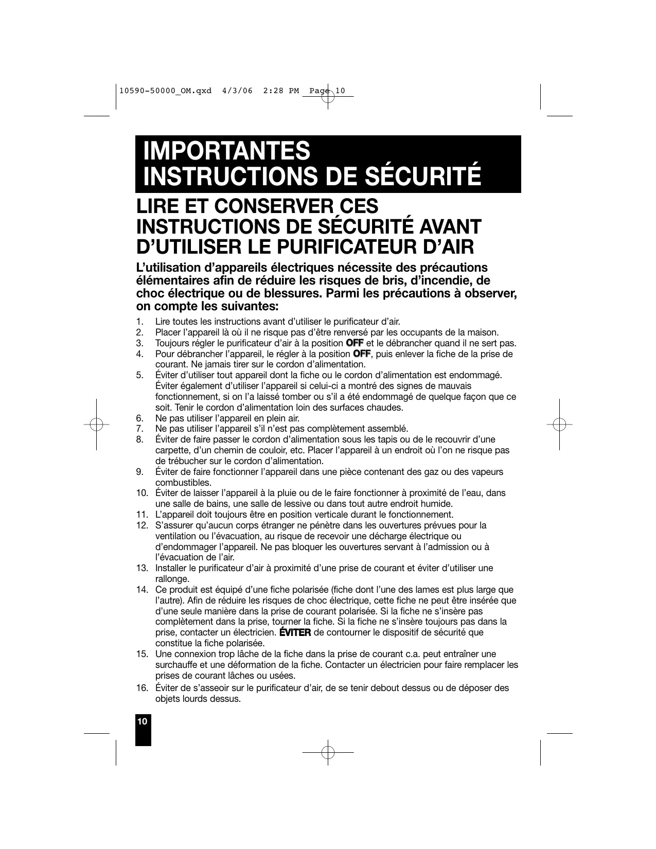 Lire toutes les instructions avant d’utiliser le purificateur d’air. Placer l’appareil là où il ne risque pas d’être renversé par les occupants de la maison. Toujours régler le purificateur d’air à la position OFF et le débrancher quand il ne sert pas. Pour débrancher l’appareil, le régler à la position OFF, puis enlever la fiche de la prise de courant. Ne jamais tirer sur le cordon d’alimentation. Éviter d’utiliser tout appareil dont la fiche ou le cordon d’alimentation est endommagé. Éviter également d’utiliser l’appareil si celui-ci a montré des signes de mauvais fonctionnement, si on l’a laissé tomber ou s’il a été endommagé de quelque façon que ce soit. Tenir le cordon d’alimentation loin des surfaces chaudes. Ne pas utiliser l’appareil en plein air. Ne pas utiliser l’appareil s’il n’est pas complètement assemblé. Éviter de faire passer le cordon d’alimentation sous les tapis ou de le recouvrir d’une carpette, d’un chemin de couloir, etc. Placer l’appareil à un endroit où l’on ne risque pas de trébucher sur le cordon d’alimentation. Éviter de faire fonctionner l’appareil dans une pièce contenant des gaz ou des vapeurs combustibles. Éviter de laisser l’appareil à la pluie ou de le faire fonctionner à proximité de l’eau, dans une salle de bains, une salle de lessive ou dans tout autre endroit humide. L’appareil doit toujours être en position verticale durant le fonctionnement. S’assurer qu’aucun corps étranger ne pénètre dans les ouvertures prévues pour la ventilation ou l’évacuation, au risque de recevoir une décharge électrique ou d’endommager l’appareil. Ne pas bloquer les ouvertures servant à l’admission ou à l’évacuation de l’air. Installer le purificateur d’air à proximité d’une prise de courant et éviter d’utiliser une rallonge. Ce produit est équipé d’une fiche polarisée (fiche dont l’une des lames est plus large que l’autre). Afin de réduire les risques de choc électrique, cette fiche ne peut être insérée que d’une seule manière dans la prise de courant polarisée. Si la fiche ne s’insère pas complètement dans la prise, tourner la fiche. Si la fiche ne s’insère toujours pas dans la prise, contacter un électricien. ÉVITER de contourner le dispositif de sécurité que constitue la fiche polarisée. Une connexion trop lâche de la fiche dans la prise de courant c.a. peut entraîner une surchauffe et une déformation de la fiche. Contacter un électricien pour faire remplacer les prises de courant lâches ou usées. Éviter de s’asseoir sur le purificateur d’air, de se tenir debout dessus ou de déposer des objets lourds dessus. 10590-50000_OM.qxd 4/3/06 2:28 PM Page 11