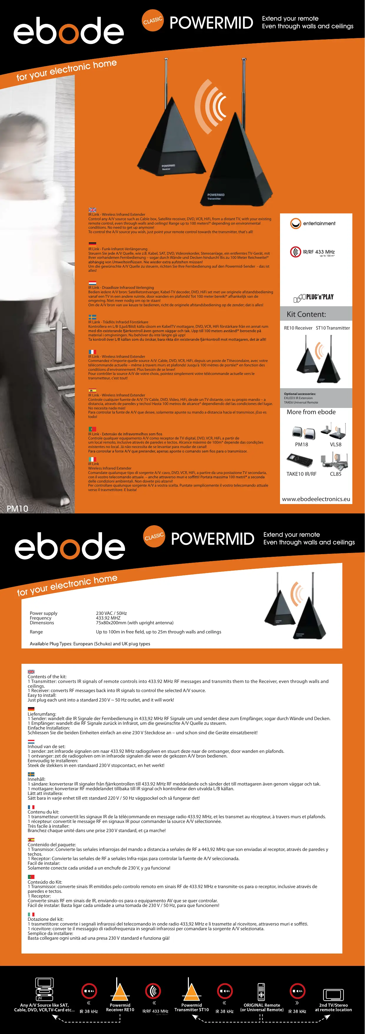Contenu du kit: 1 transmetteur convert les signaux IR de la telekomande en message radio 433 92 MHz et les transmit au recepteur a travers murs et plafonds 1 recepteur convertit le message RF en signaux IR pour commander la source A/V selectionnee. Très facile à installer: Branchez chaque unité dans une prise 230 V standard, et sa marché!
