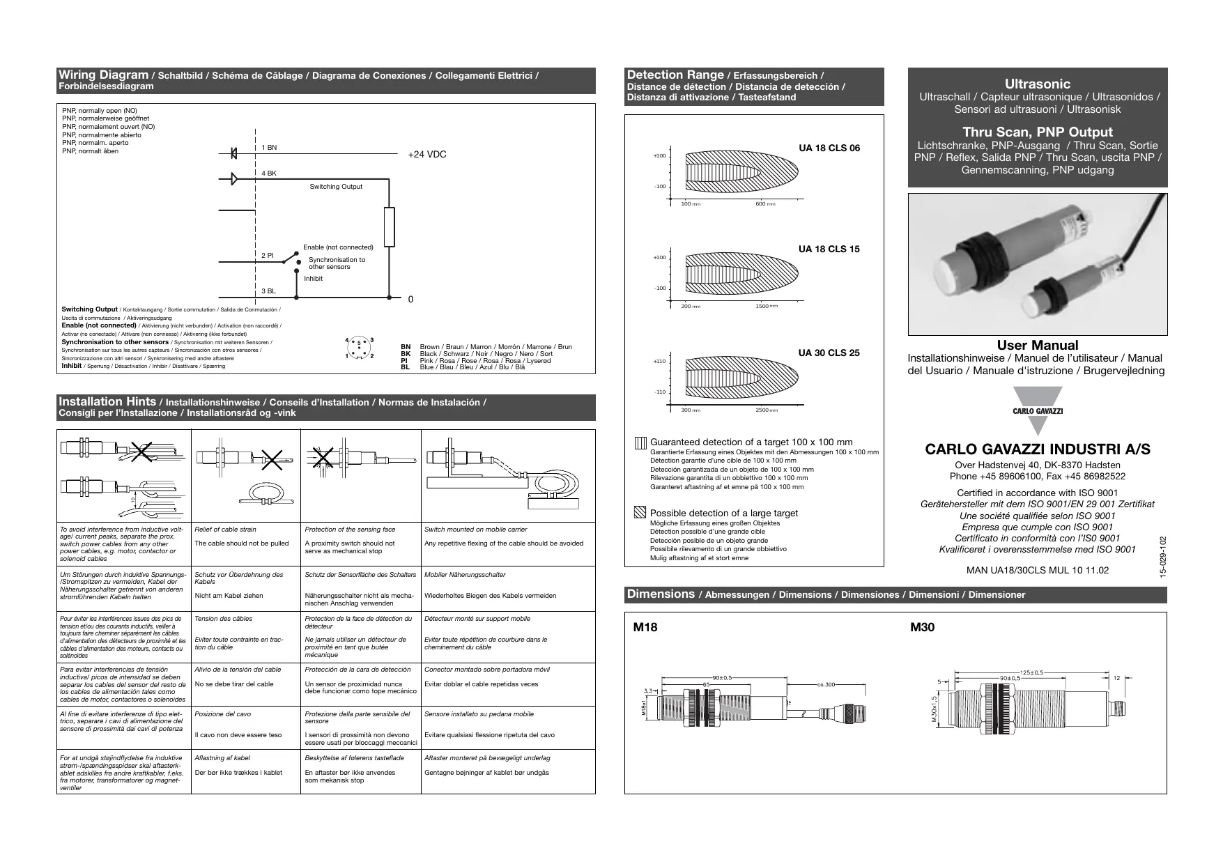 UA 18 CLS - Capteur ultrasonique CARLO GAVAZZI - Notice d'utilisation et mode d'emploi gratuit