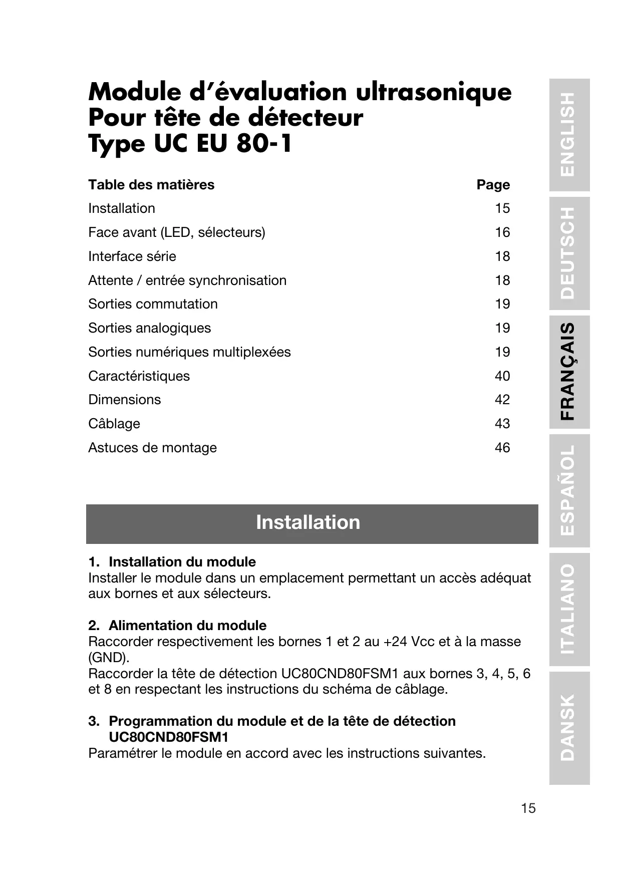 ITALIANO Installation DEUTSCH Page DANSK Table des matières ENGLISH Module d’évaluation ultrasonique Pour tête de détecteur Type UC EU 80-1 ENGLISH Face avant Cette section décrit brièvement les sélecteurs et les LED montés en totalité sur la face avant. ITALIANO DANSK F 0 12