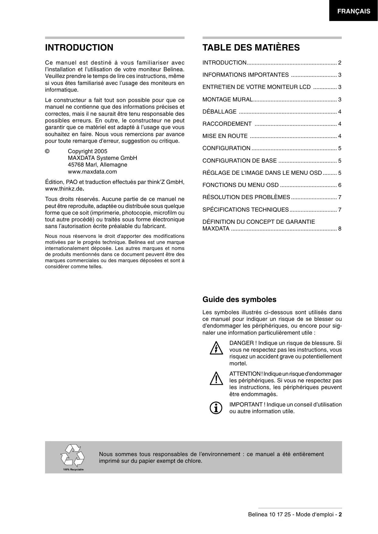 Nous sommes tous responsables de l'environnement : ce manuel a eté entièrement imprimé sur du papier exempt de chlore.
