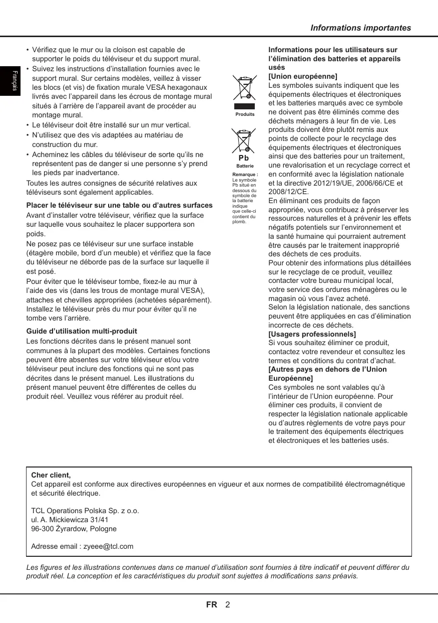 Cet appareil est conforme aux directives européennes en vigueur et aux normes de compatibilité électromagnétique et sécurité électrique. TCL Operations Polska Sp. z o.o. ul. A. Mickiewicza 31/41 Connexion du lecteur de disques Blu-ray, de la console de jeux HD, du caméscope HD, des casques, du module CI……………………………………………… 5