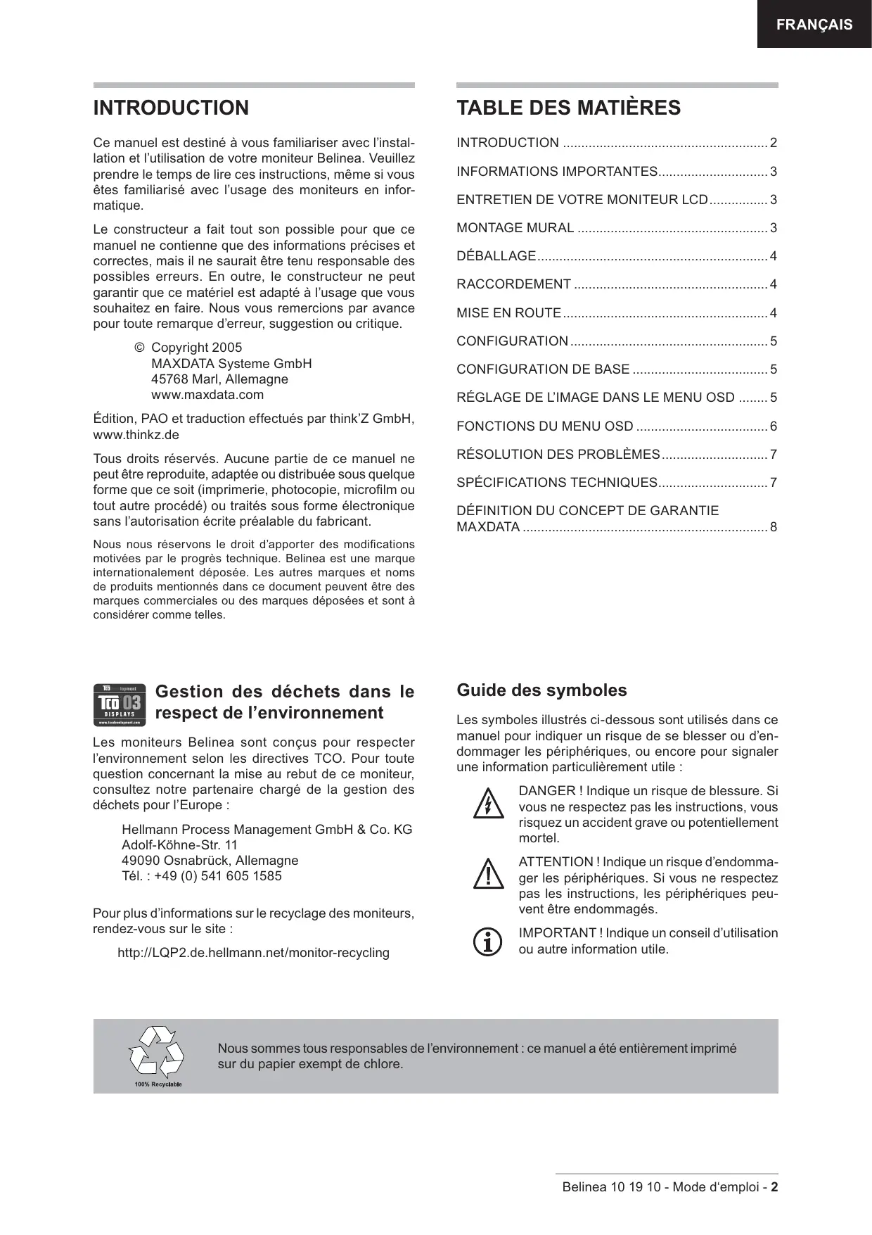 Les moniteurs Belinea sont conçus pour respecter l'environnement selon les directives TCO. Pour toute question concernant la mise au rebut de ce moniteur, consultez notre partenaire chargé de la gestion des déchets pour l'Europe :