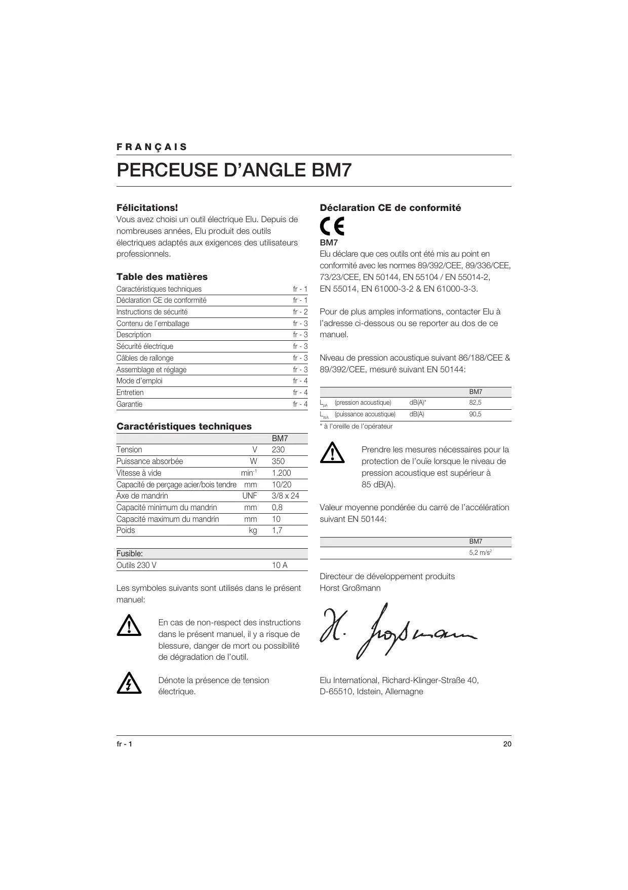 Caractéristiques techniques Déclaration CE de conformité Instructions de sécurité Contenu de l’emballage Description Sécurité électrique Câbles de rallonge Assemblage et réglage Mode d’emploi Entretien Garantie EN 55014, EN 61000-3-2 & EN 61000-3-3. Pour de plus amples informations, contacter Elu à l’adresse ci-dessous ou se reporter au dos de ce manuel. Niveau de pression acoustique suivant 86/188/CEE & 89/392/CEE, mesuré suivant EN 50144: BM7 LpA Capacité minimum du mandrin Capacité maximum du mandrin Poids