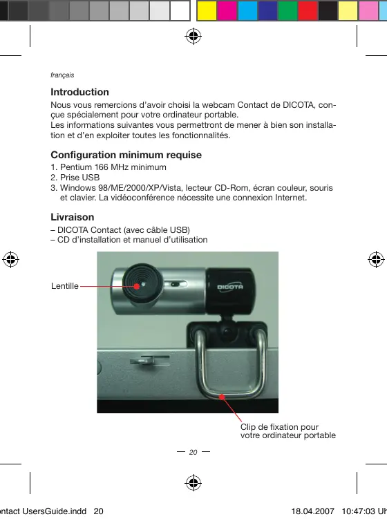 Nous vous remercions d'avoir choisi la webcam Contact de DICOTA, conçue spécialement pour votre ordinateur portable.