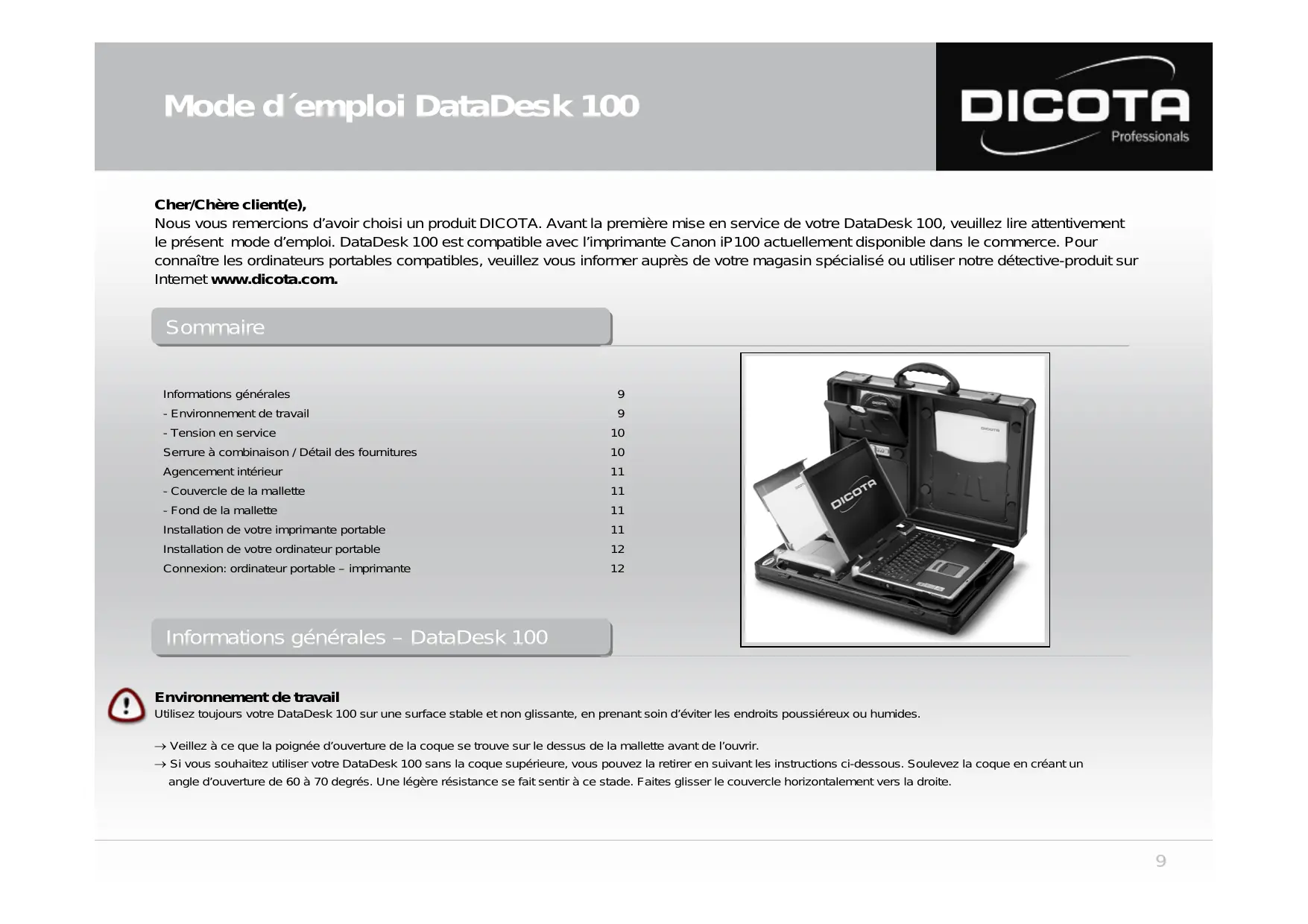 Nous vous remercions d'avoir choisi un produit DICOTA. Avant la première mise en service de votre DataDesk 100, veuillez lire attentivement le présent mode d'emploi. DataDesk 100 est compatible avec l'imprimante Canon iP100 actuellement disponible dans le commerce. Pour connaître les ordinateurs portables compatibles, veuillez vous informer auprès d'un magasin spécialisé ou utiliser notre détecteur-produit sur Internet www.dicota.com.