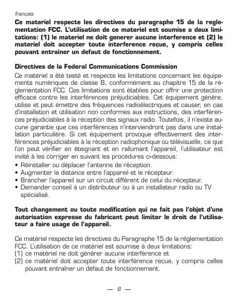 - Demander conseil à un distributeur ou à un installateur radio ou TV spécialisé. Tout changement ou toute modification qui ne fait pas l’objet d’une autorisation expresse du fabricant peut limiter le droit de l’utilisateur a faire usage de l’appareil. Ce matériel respecte les directives du Paragraphe 15 de la réglementation FCC. L’utilisation de ce matériel est soumise à deux limitations: (1) ce matériel ne doit générer aucune interférence et (2) ce matériel doit accepter toute interférence reçue, y compris celles pouvant entraîner un défaut de fonctionnement.