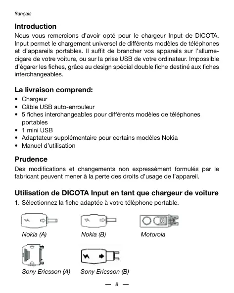 Nous vous remercions d'avoir opté pour le chargeur Input de DICOTA. Input permet le chargement universel de différents modèles de téléphones et d'appareils portables. Il suffit de brancher vos appareils sur l'allume-cigare de votre voiture, ou sur la prise USB de votre ordinateur. Impossible d'égarer les fiches, grâce au design spécial double fiche destiné aux fiches interchangeables.