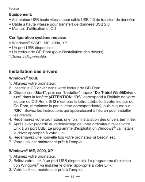 - Clique sur "Start", puis sur "Installer", tapez "D:\T-bird Win98Driver.exe" dans la fenêtre (ATTENTION: "D" correspond à l'initiale de votre lecteur de CD-Rom. Si D n'est pas la lettre attribuée à ce lecteur de CD-Rom, remplacez-la par la lettre correspondante), puis clique sur "OK". Suivez les instructions qui apparaissent à l'écran pour installer les drivers.