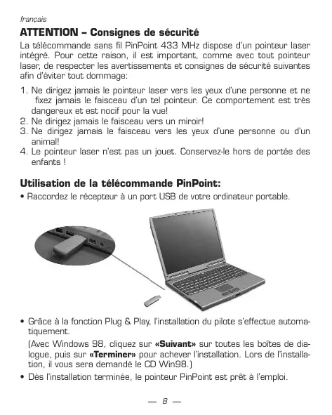 La télécommande sans fil PinPoint 433 MHz dispose d'un pointeur laser intégré. Pour cette raison, il est important, comme avec tout pointeur laser, de respecter les averissements et consignes de sécurité suivantes afin d'éviter tout dommage:
