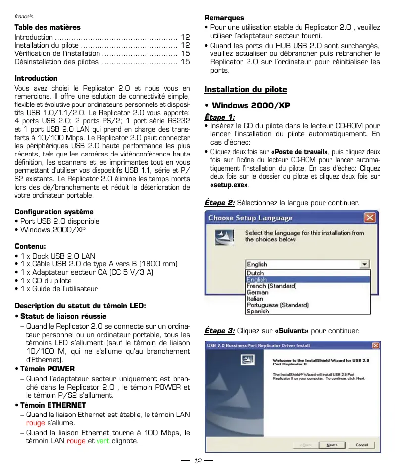 Vou avez choisi le Replicaor 2.0 et nous vous en remercions. Il offre une solution de connectivite simple, flexible et evolutive pour ordinateurs personnels et disposits USB 1.0/1.1/2.0. Le Replicaor 2.0 you apporte: 4 ports USB 2.0; 2 ports PS/2; 1 port series RS232 et 1 port USB 2.0 LAN qui prend en charge des transferts a 10/100 Mbps. Le Replicaor 2.0 peut connecter les peripheriques USB 2.0 haute performance les plus recentes, tels que les cameras de videoconference haute definition, les scanners et les imprimantes tout en vous permettant d'utiliser vos dispositifs USB 1.1, serie et P/S2 existants. Le Replicaor 2.0 elimine les temps morts lors des de/branchements et reduit la détérioration de votre ordinateur portable.