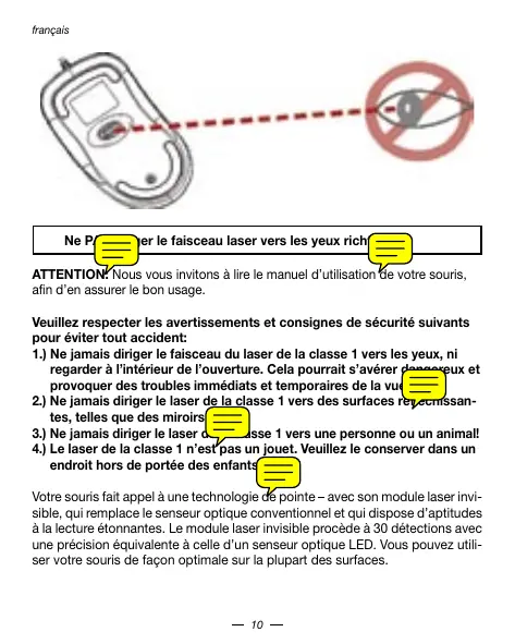 Votre souris fait appel à une technologie de pointe – avec son module laser invisible, qui remplace le senseur optique conventionnel et qui dispose d'aptitudes à la lecture étonnantes. Le module laser invisible procède à 30 déetections avec une précision équivalente à celle d'un senseur optique LED. Vous pouvez utiliser cette souris de façon optimale sur la plupart des surfaces.
