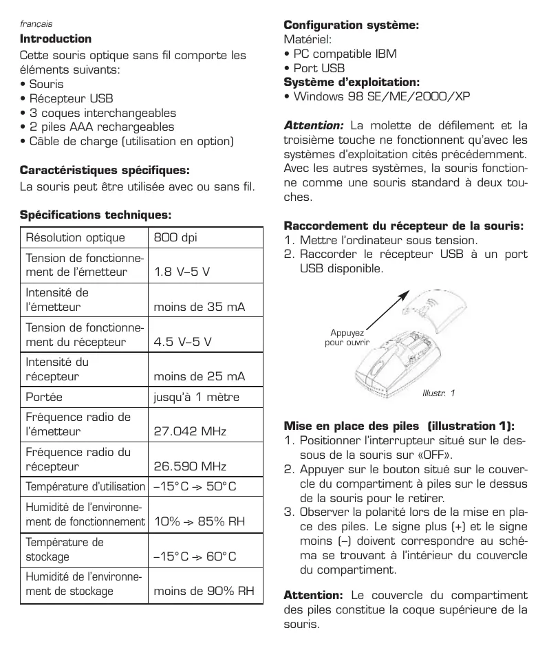 Attention: N'employer que des piles rechargeables lors du rechargement de la souris, sous peine de la faire éclater.