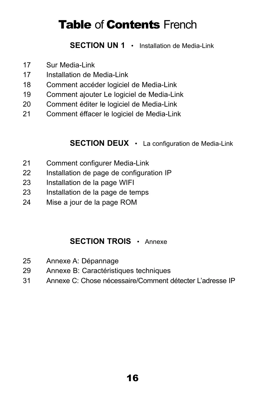 Sur Media-Link Installation de Media-Link Comment accéder logiciel de Media-Link Comment ajouter Le logiciel de Media-Link Comment éditer le logiciel de Media-Link Comment éffacer le logiciel de Media-Link SECTION DEUX • La configuration de Media-Link