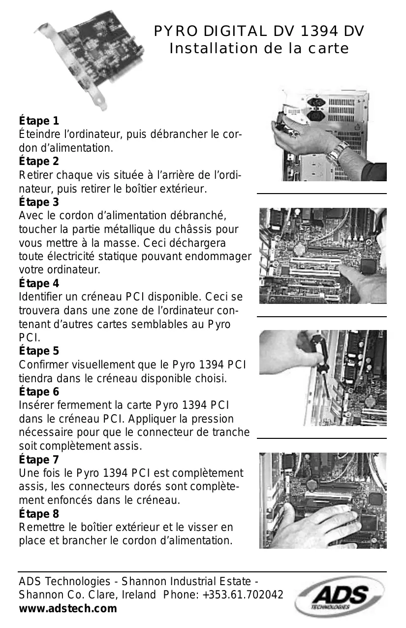 Installation de la carte Étape 1 Éteindre l’ordinateur, puis débrancher le cordon d’alimentation. Étape 2 Retirer chaque vis située à l’arrière de l’ordinateur, puis retirer le boîtier extérieur. Étape 3 Avec le cordon d’alimentation débranché, toucher la partie métallique du châssis pour vous mettre à la masse. Ceci déchargera toute électricité statique pouvant endommager votre ordinateur. Étape 4 Identifier un créneau PCI disponible. Ceci se trouvera dans une zone de l’ordinateur contenant d’autres cartes semblables au Pyro PCI. Étape 5 Confirmer visuellement que le Pyro 1394 PCI tiendra dans le créneau disponible choisi. Étape 6 Insérer fermement la carte Pyro 1394 PCI dans le créneau PCI. Appliquer la pression nécessaire pour que le connecteur de tranche soit complètement assis. Étape 7 Une fois le Pyro 1394 PCI est complètement assis, les connecteurs dorés sont complètement enfoncés dans le créneau. Étape 8 Remettre le boîtier extérieur et le visser en place et brancher le cordon d’alimentation. ADS Technologies - Shannon Industrial Estate Shannon Co. Clare, Ireland Phone: +353.61.702042 www.adstech.com