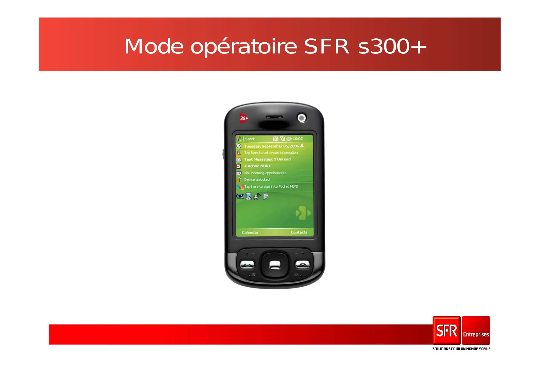 Mode opératoire SFR s300+ Modification de la connexion Web sur SFR s300+ A partir de l’écran d’accueil, cliquez sur Démarrer puis Paramètres. Une nouvelle fenêtre s’ouvre. Cliquez sur l’onglet Connexions… …puis sur l’icône Connexions Une nouvelle fenêtre s’ouvre. WEB SFR GPRS signifie que vous êtes paramétrés en mode Web. Cliquez sur l’onglet Avancés pour modifier ce paramétrage Modification de la connexion Web sur SFR s300+ Cliquez sur Sélectionner des Réseaux Dans la nouvelle fenêtre, cliquez sur le premier menu déroulant et choisissez Business SFR Mail. Puis cliquez sur Ok Pour vérifier le paramétrage, cliquez sur l’onglet Tâches… La fenêtre suivante vous confirme que la connexion a été modifiée